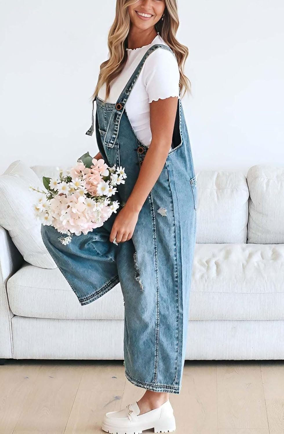 Baggy denim overalls with bib pocket in front, featuring intentionally broken holes for a stylish look, comfy wide leg design, side button closure, about ankle length