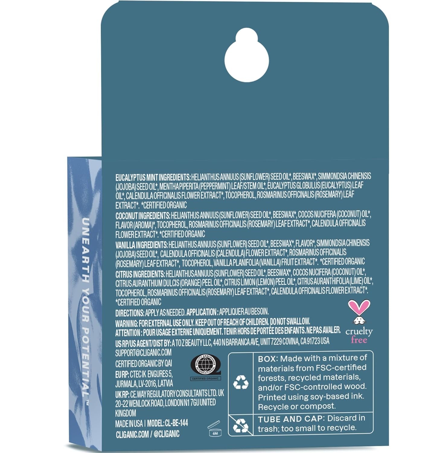 Cruelty-Free, Made in USA – Cliganic organic lip balms are proudly certified cruelty-free and made in the USA.