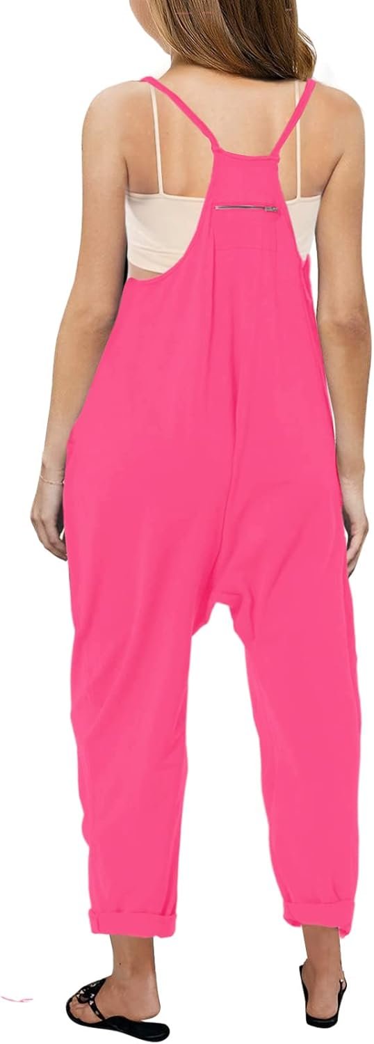 Deep V neck, sleeveless, long pants, back pocket decoration, loose casual jumpsuit with adjustable spaghetti straps, soft overalls, two side big pockets.
