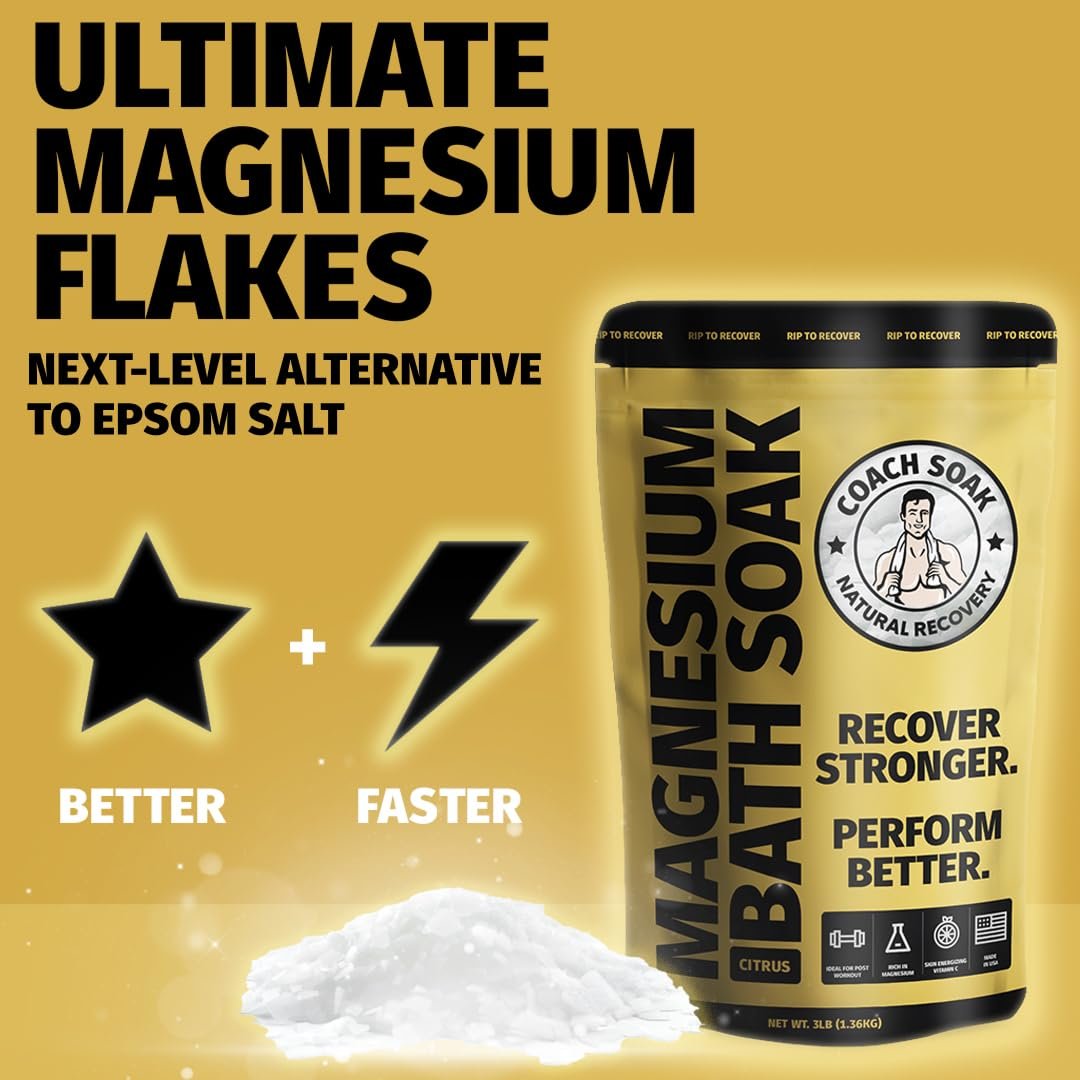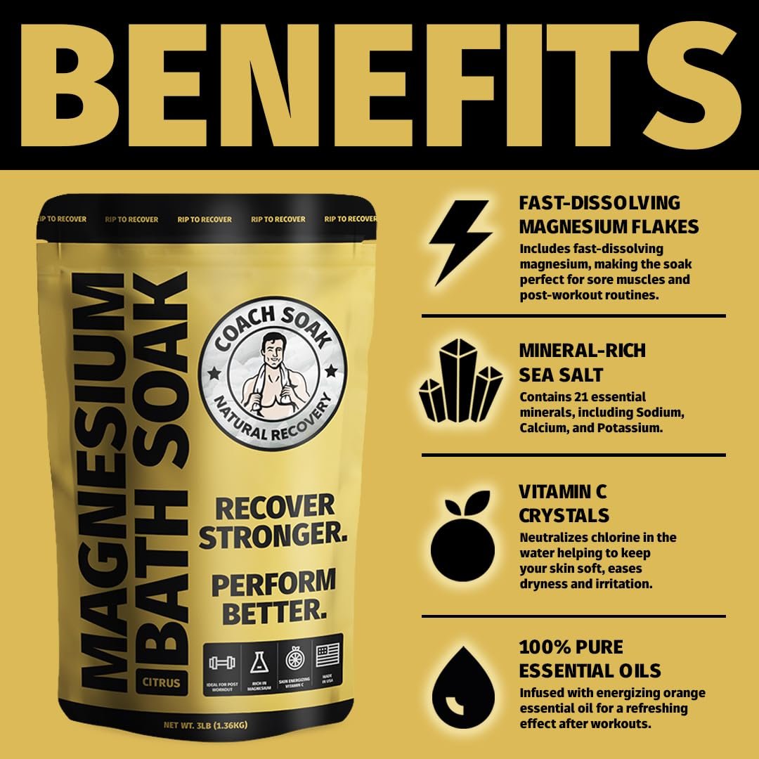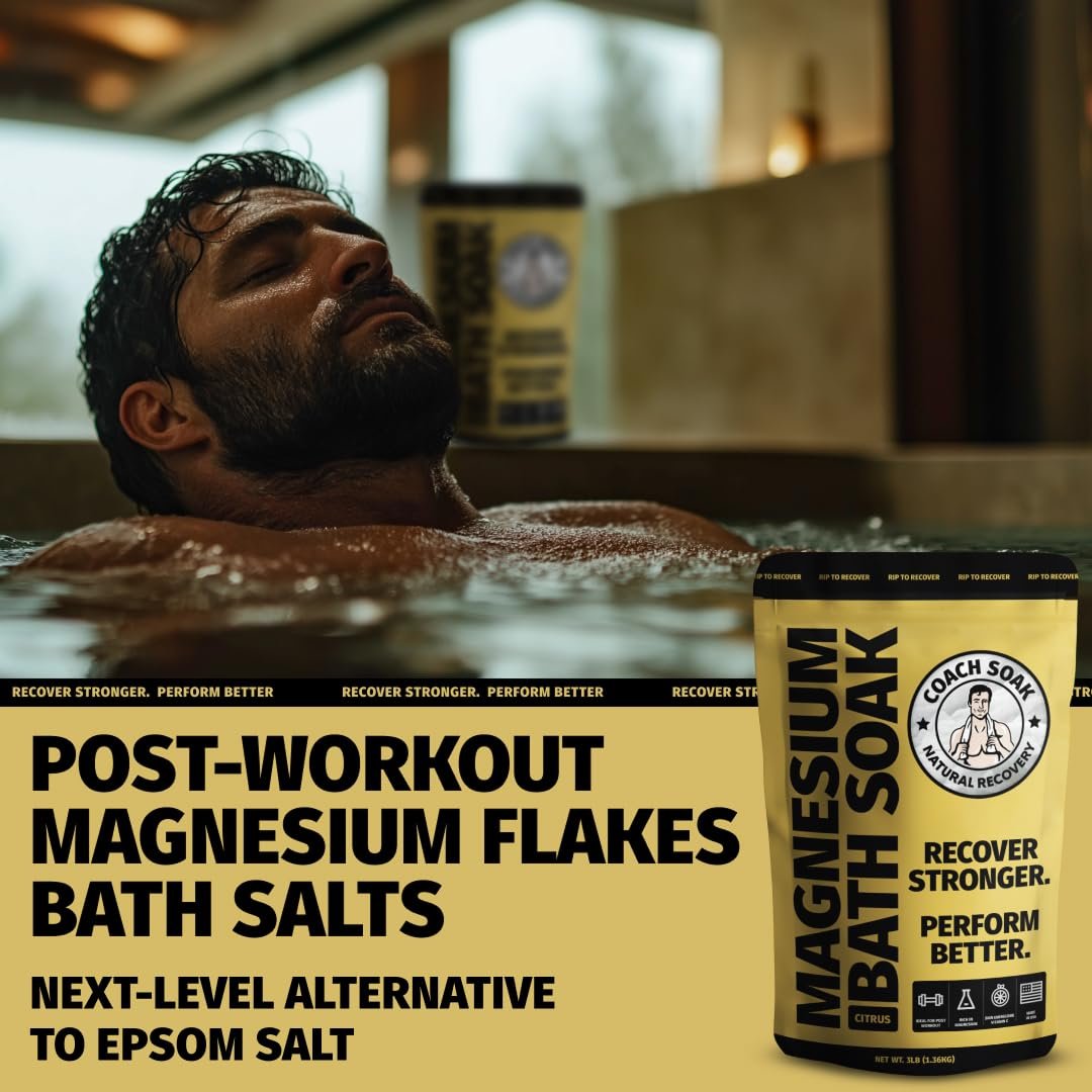 Coach Soak Recovery Bath Soak – Alternative to Epsom Salt Bath Soak – Fast-Absorbing Pure Magnesium Flakes & Dead Sea Salt with 21 Minerals, Bath Salts & Essential Oils – 3 lb, Energizing Citrus