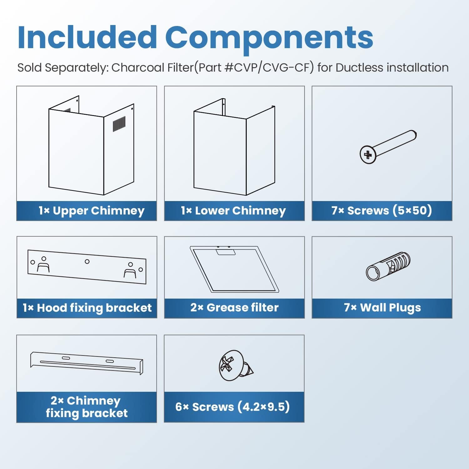 Whats In The Box: This Range Hood package includes (2) Aluminum Filter Filters, (2) Adjustable Strainless Steel Decorative Cover and (1) Screw Pack. NOT INCLUDED: (For Ductless Installation: The Comfee 2 Pack Carbon Filter Kit can be purchased separately: Part # CVP/CVG-CF (Please search B09C74226L on Amazon.)