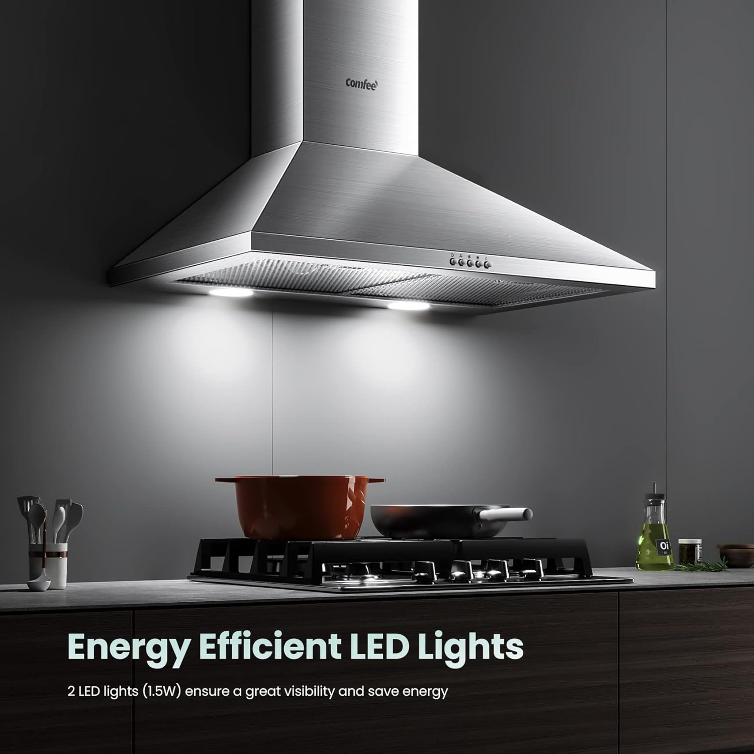 COMFEE’ CVP30W6AST Ducted Pyramid Range 450 CFM Stainless Steel Wall Mount Vent Hood with 3 Speed Exhaust Fan, 5-Layer Aluminum Permanent Filters, Two LED Lights, Convertible to Ductless, 30 inches