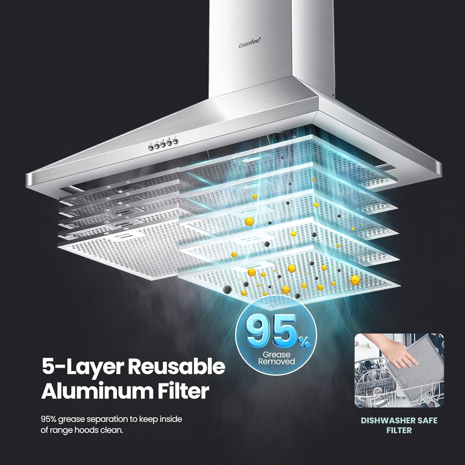 5-Layer Reusable Aluminum Filter: The 5-layer aluminum filter effectively removes grease and cooking odors. Also, being easily detached and dishwasher safe, it can always sustain its optimal efficiency.