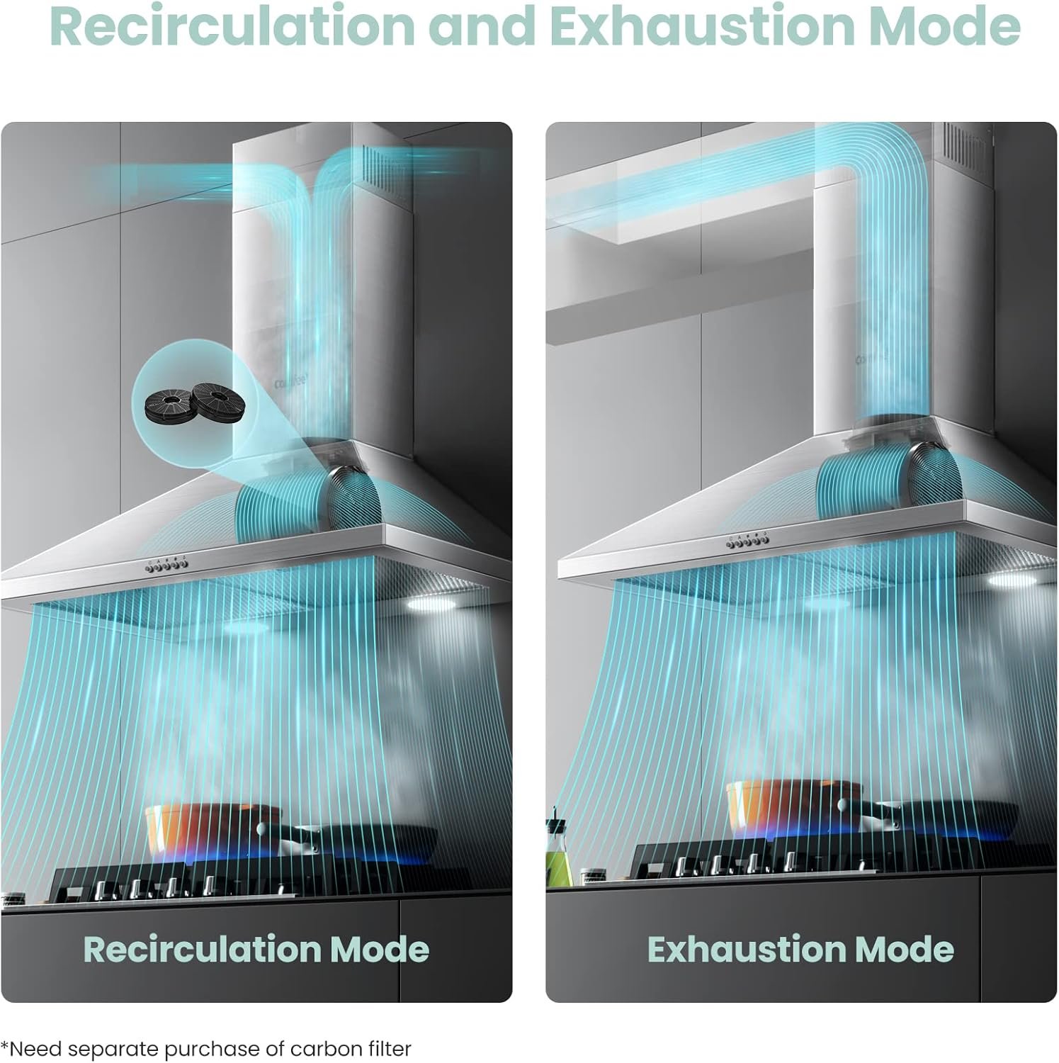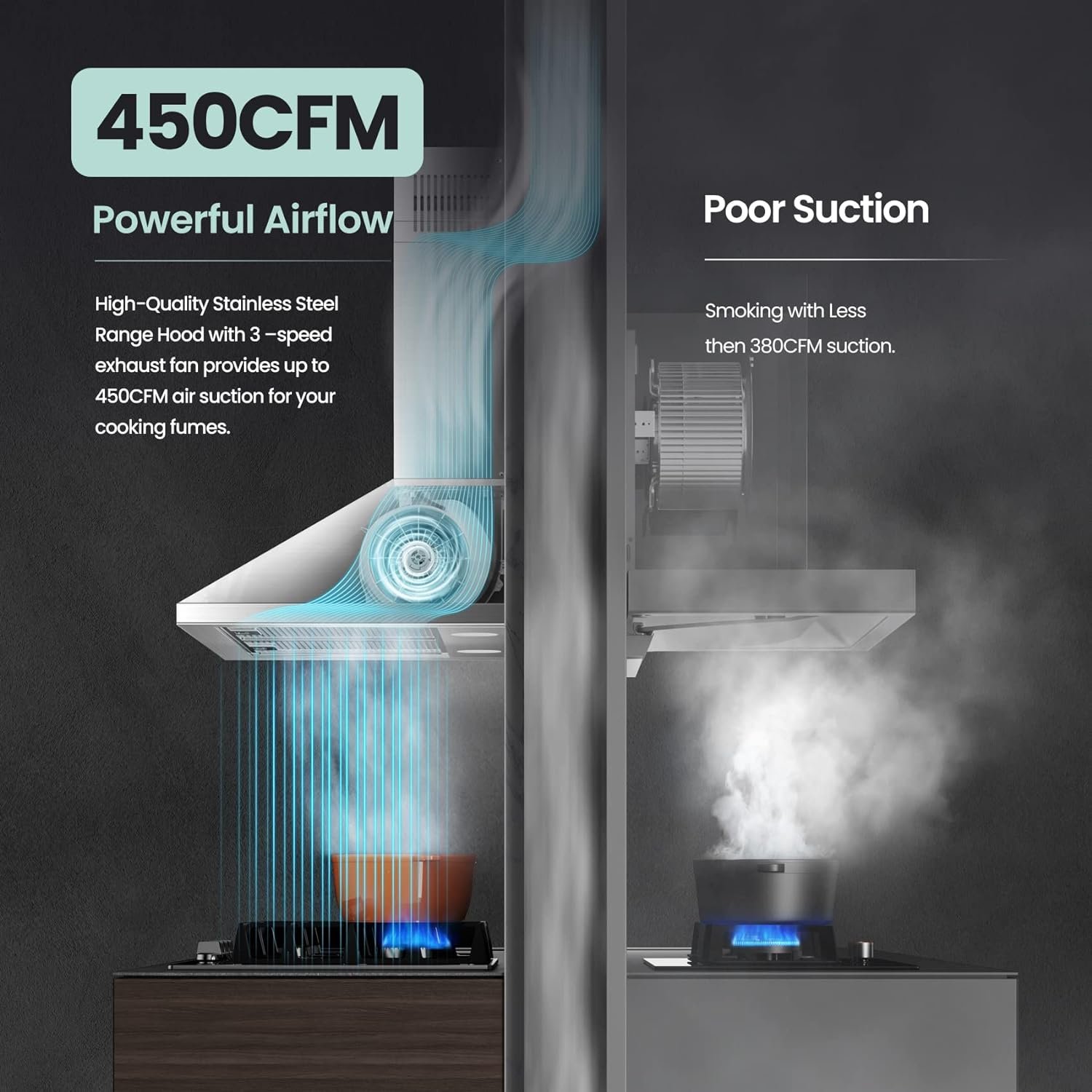 450 CFM Strong Suction: High-quality ductless range hood with 3 –speed exhaust fan provides up to 450CFM air suction for your cooking fumes, while keeping the noise low.