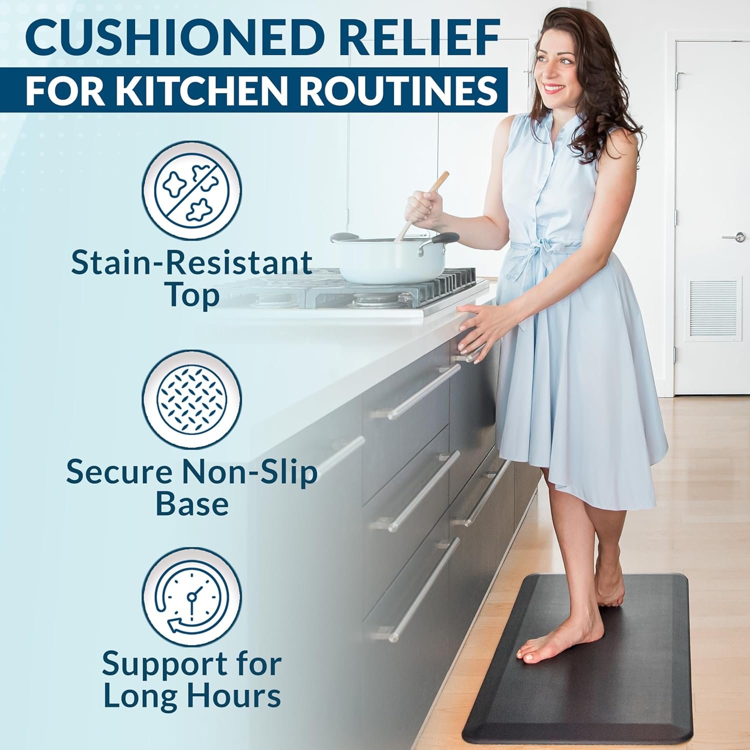 Slip-Resistant and Stain-Resistant Surface: Stay safe and clean with our anti fatigue mats for kitchen floor that feature a non-slip backing to keep it securely in place. The stain-resistant material is easy to clean and ensures your mat looks new, even with daily use.