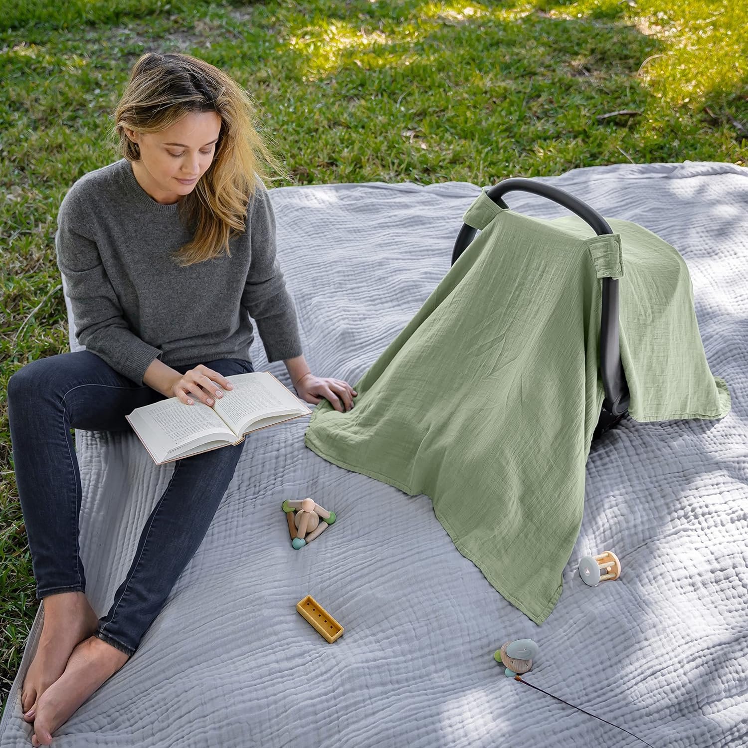 Baby Travel Gear Protection: Our muslin car seat cover offers full coverage, shielding your baby from harmful UV rays and pesky insects, providing peace of mind during your travels.