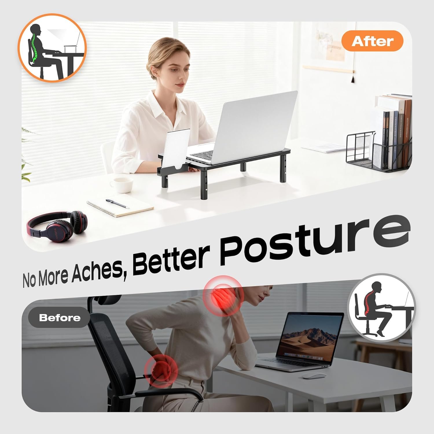 The Canyora Monitor Stand positions your screen at the ideal ergonomic height, you can truly focus on what lights you up–whether it’s a big idea, a loved one’s laugh, or simply the joy of a pain-free afternoon.