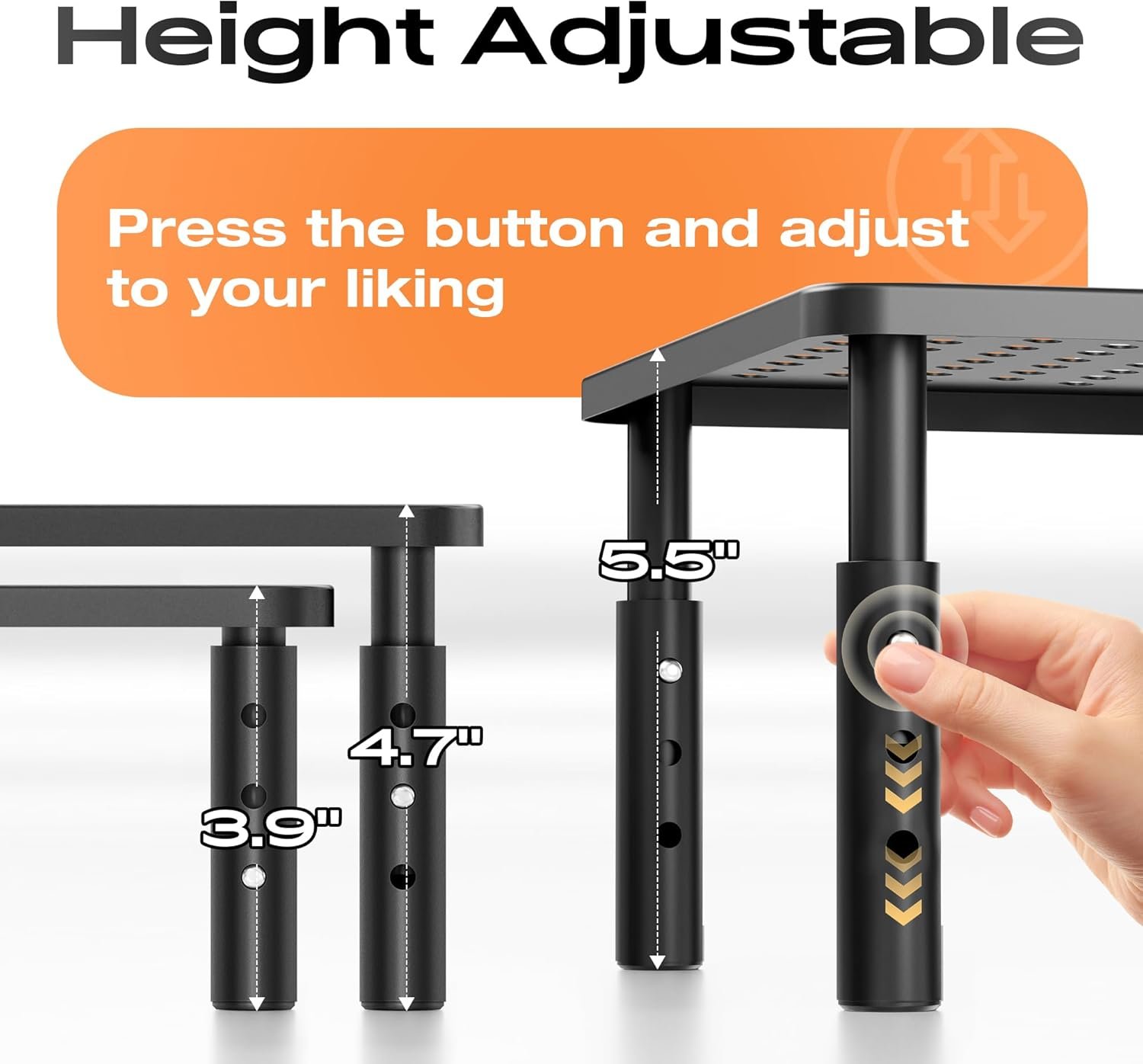 Comfortable Viewing Experience: The computer monitor stand riser has 3 adjustable ergonomic height sets at 4.13″/4.92″/5.7″ for desk, pc, laptop, tv. You can set your comfortable viewing sitting height by pressing the buttons on the monitor stand riser legs, reduce neck back pain caused by bad viewing sitting, and relax your day