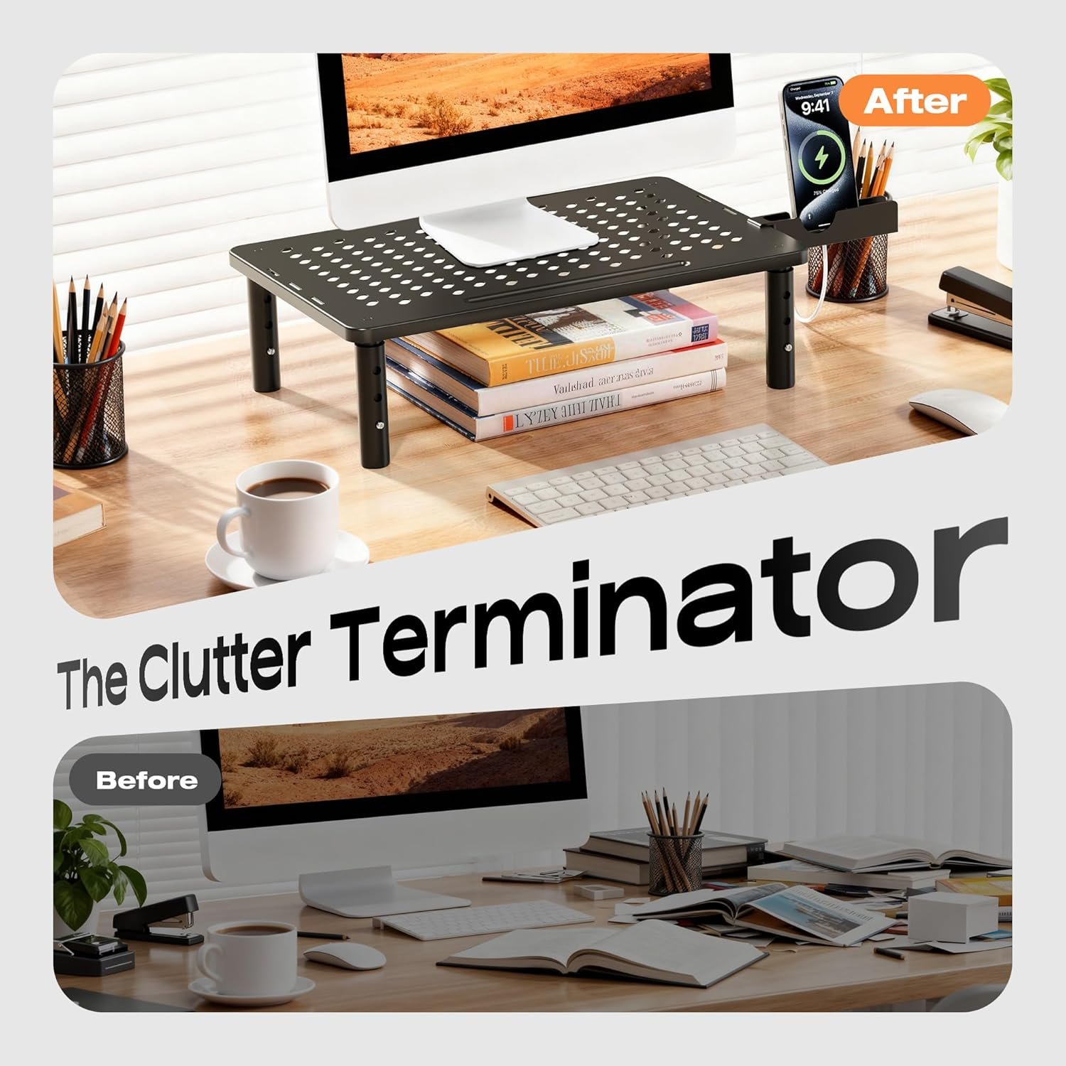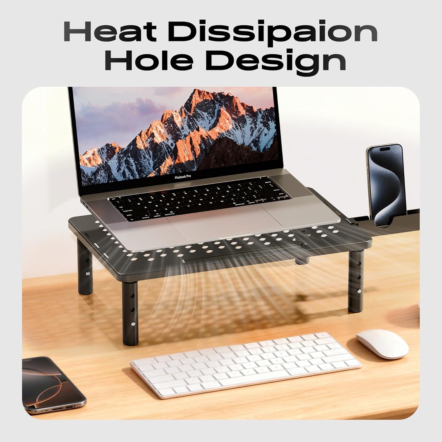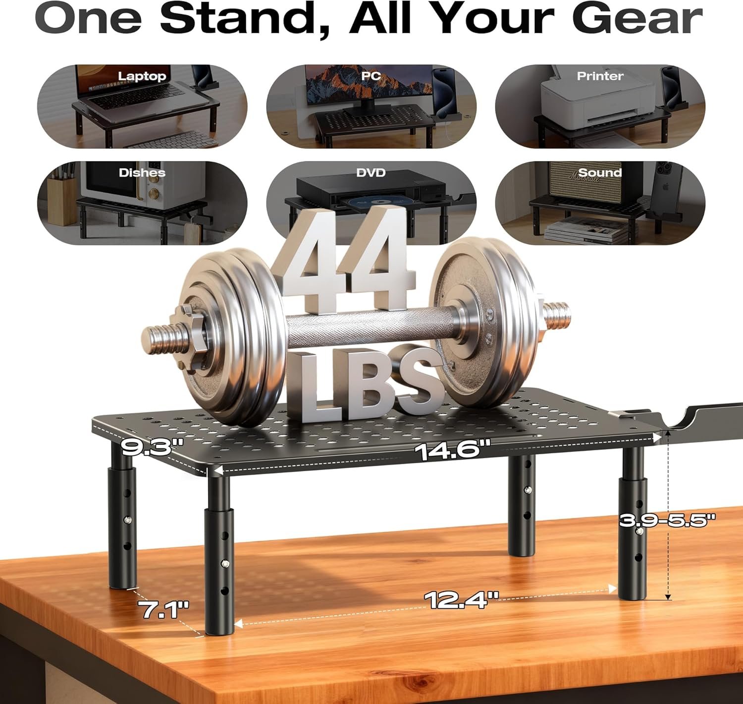 Practical & Durable Design: The computer monitor stand riser features precisely 150 heat dissipation holes to actively prevent your desktop computer or laptop from overheating, ensuring better performance and a longer lifespan for your equipment. And the metal shelf pc holder riser is made of cold-rolled steel with waterproof & anti-rust coating, can load up to 44 lbs, with the rubber stand pads which prevent slip or scratch to your desk surface