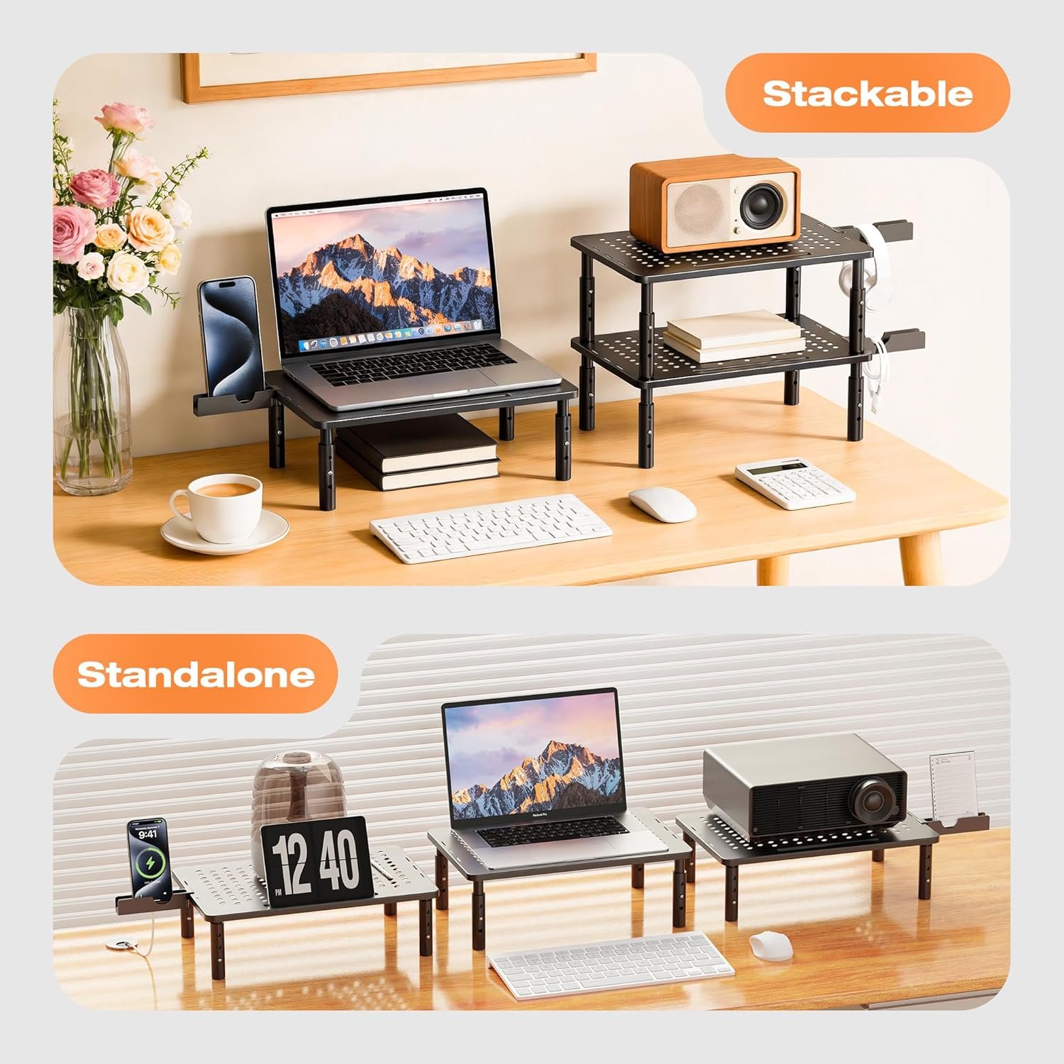 Spacious & Organized Space: The adjustable computer monitor stand provides extra storage space underneath the platform, and this pc stand riser has a large 14.6″x9.3″ desktop, you can easily organize and store your stuff like book. And you can stack two monitor stand shelf together on desk to double the storage space
