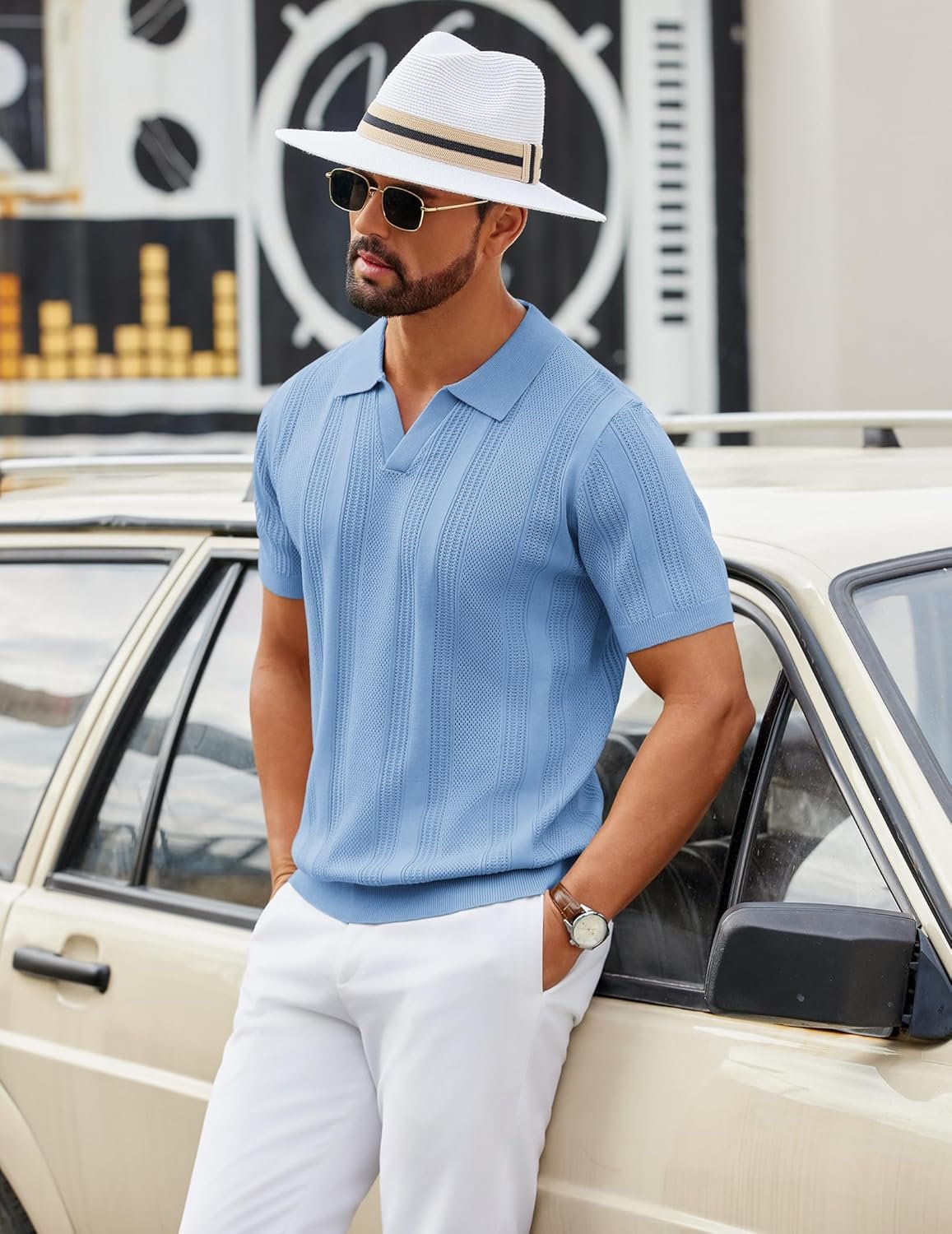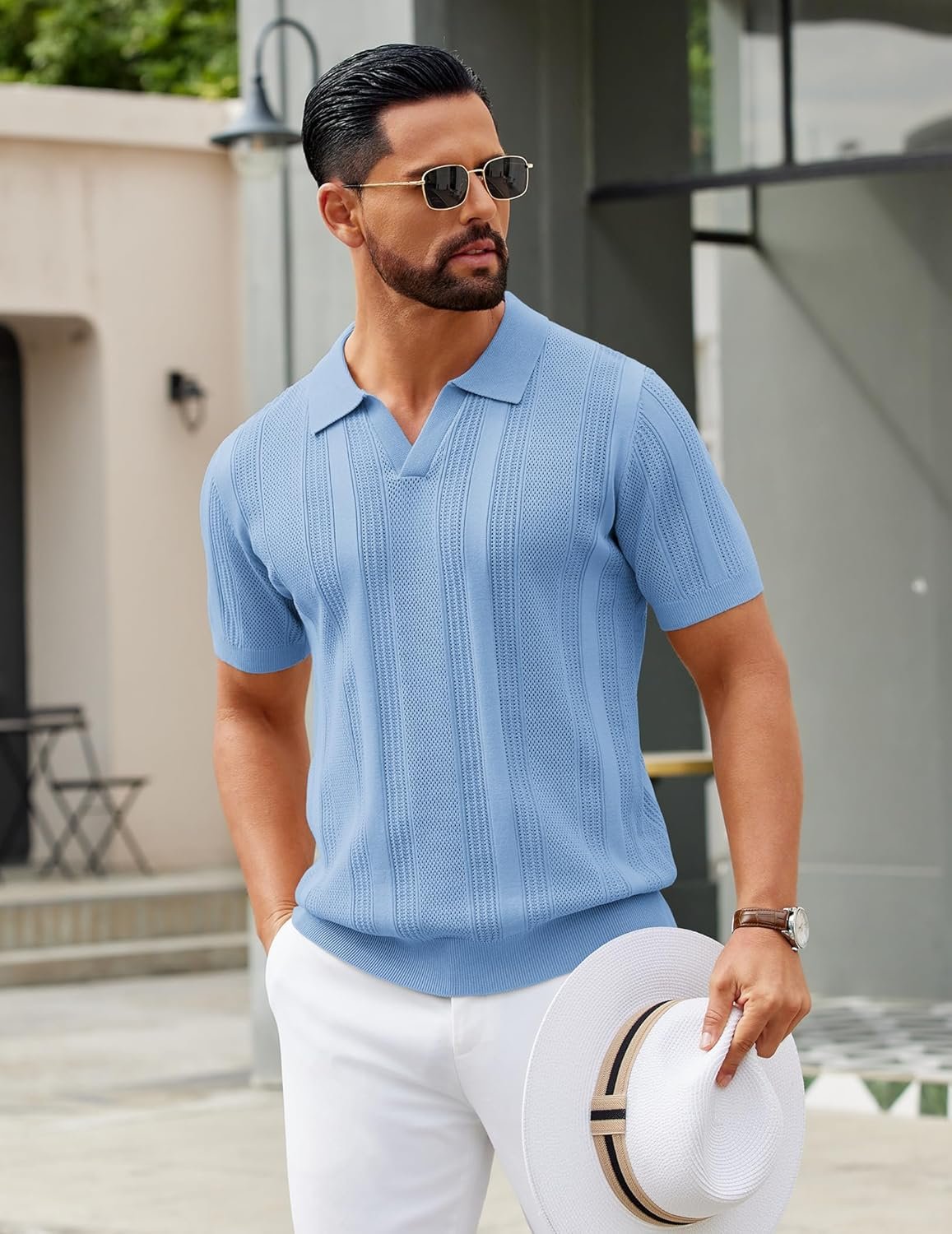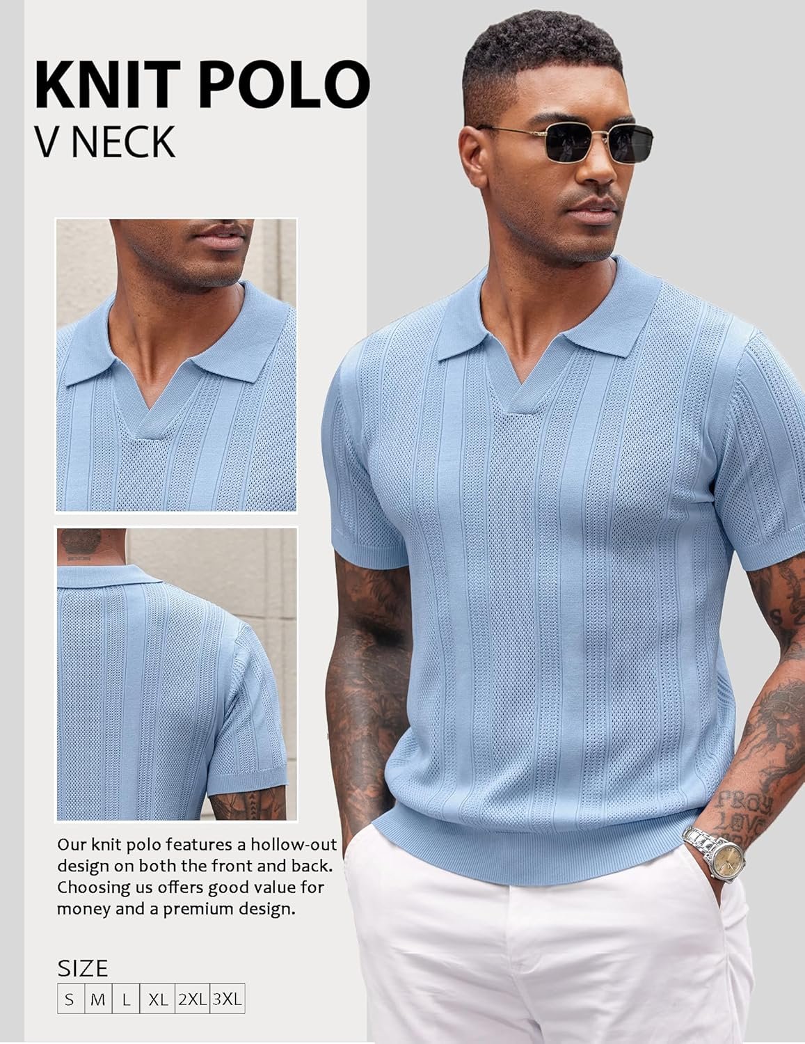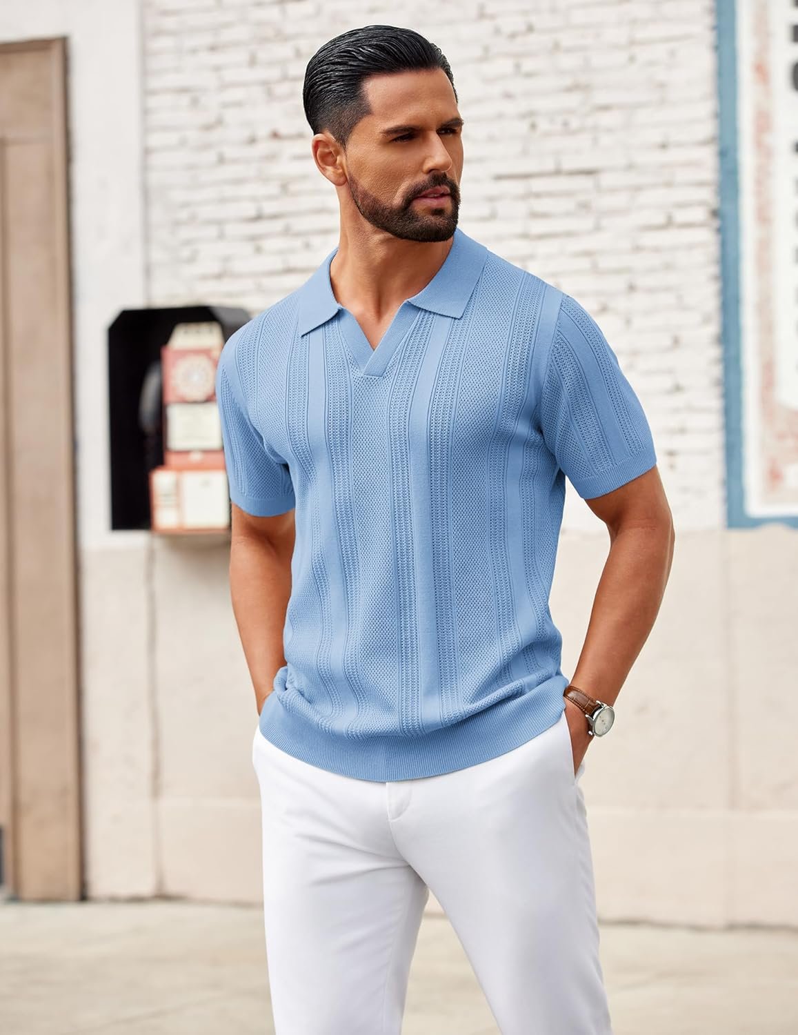 COOFANDY Mens Knit Polo Shirts V Neck Textured Polo Shirts Short Sleeve Breathable Polo Casual Collared T Shirt Fashion Tops