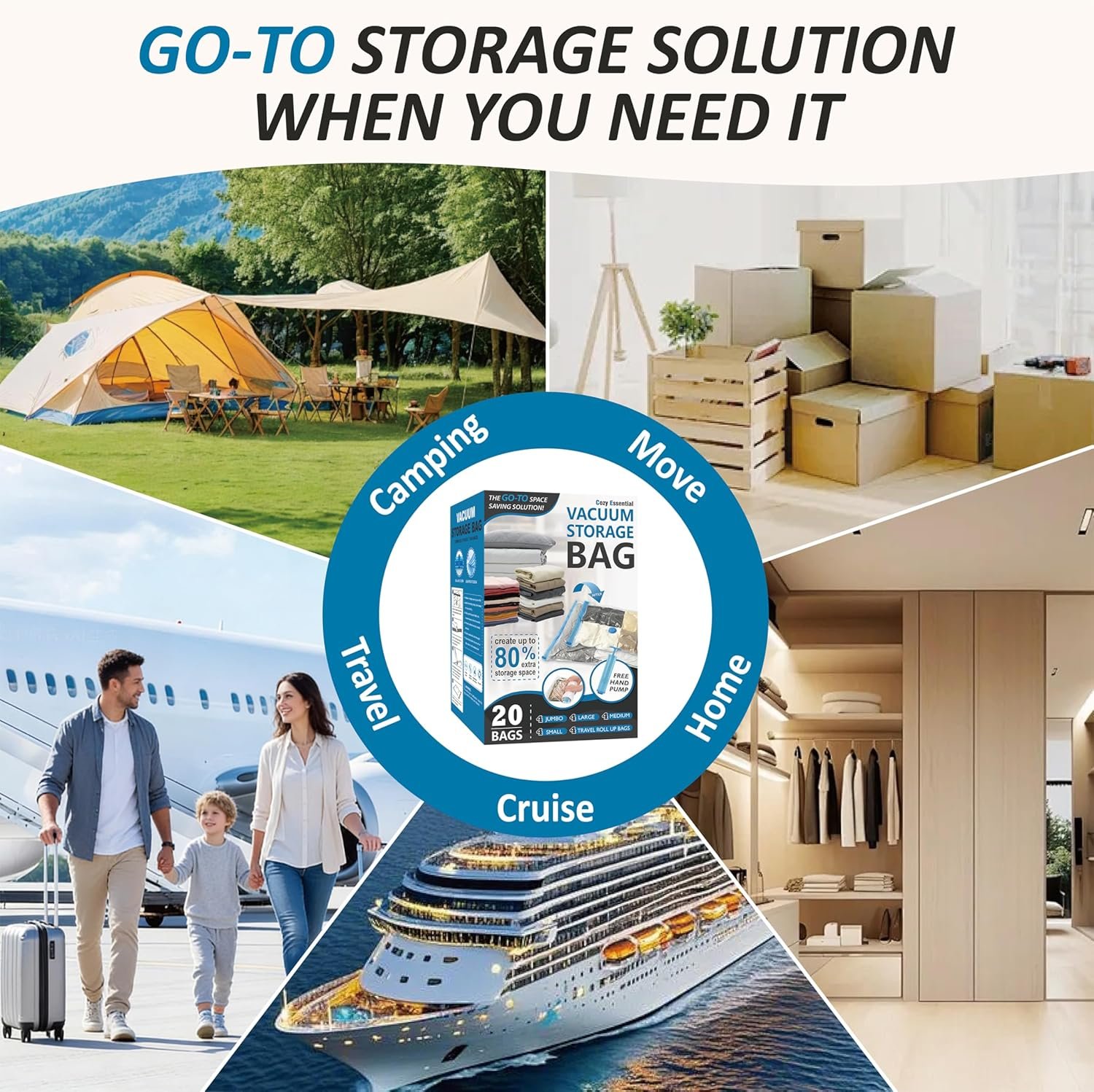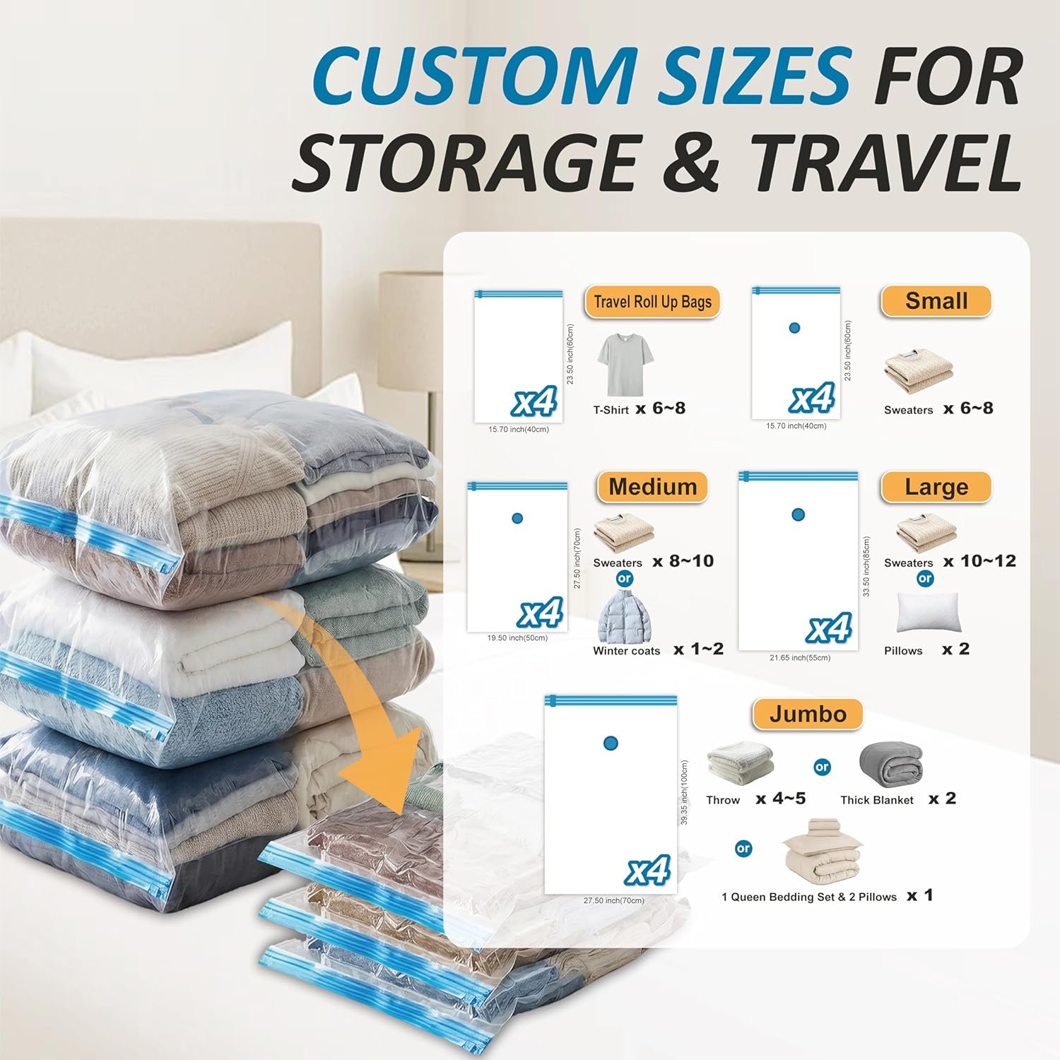 Expand your storage by up to 80%: Our vacuum seal storage bags effortlessly compress clothes, blankets, pillows, and travel essentials in seconds, transforming overcrowded closets and overpacked suitcases into clean, organized space- no clutter at home, no unnecessary luggage fees. Just more room whenever you need it.