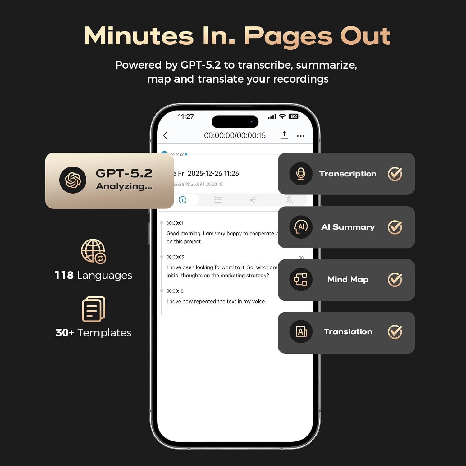 Turn Conversations into Action: AI Voice Recorder powered by GPT-5.2 turns recordings into accurate transcripts, concise summaries, speaker identification, structured templates, and mind maps. Built for meetings, lectures, interviews, and call recording, it helps transform conversations into clear, usable output with less manual work. The built-in OLED Display provides real-time recording status, so you can stay focused and confident in every session.