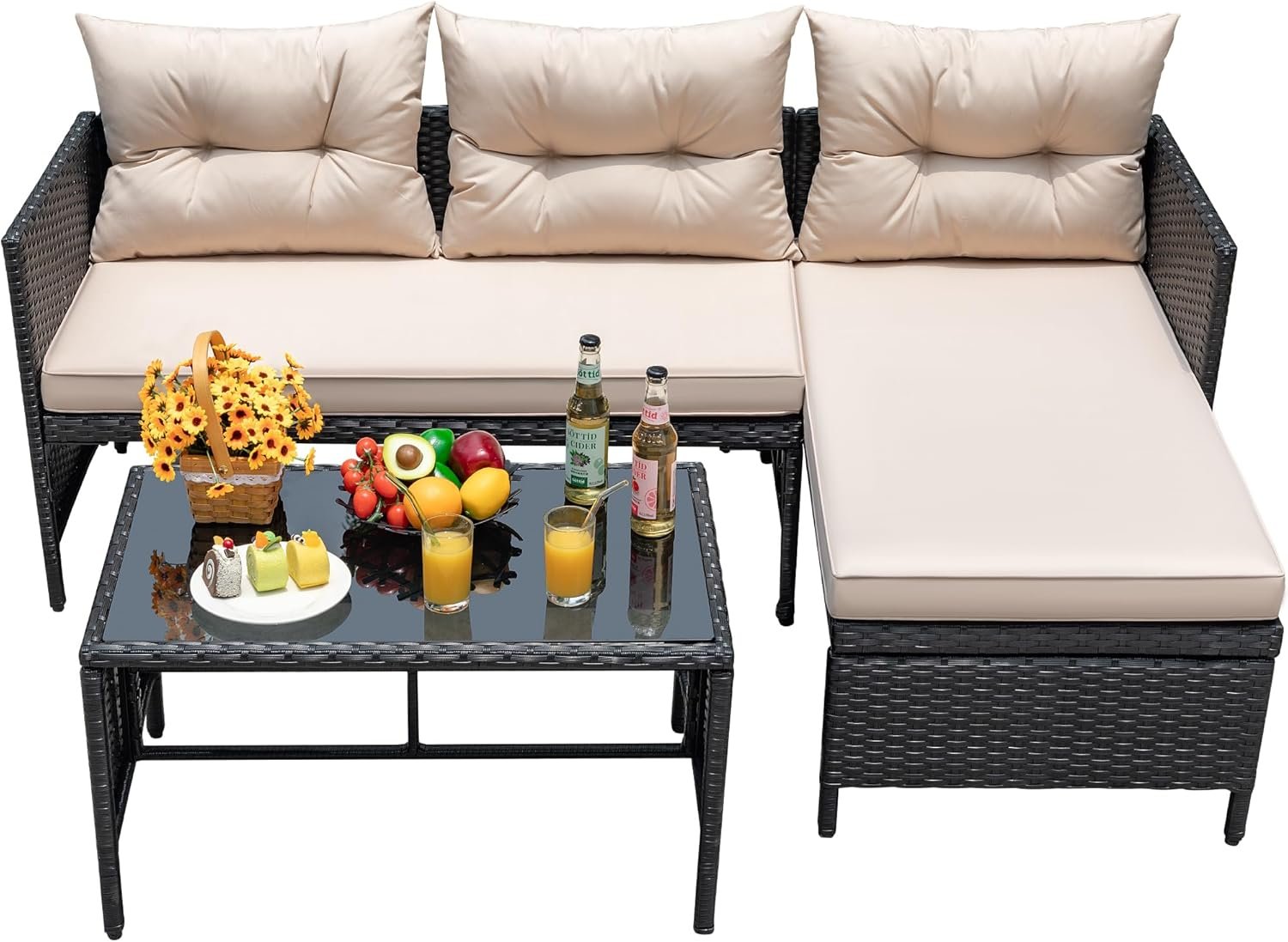 EASY CLEANING AND MAINTAIN:The cushion covers of this outdoor sectional furniture set are lightly removable with a zipper design for easy cleaning of dirty stains. The waterproof cover allows you to not have to worry about rain and spills. In addition, the glass table has a heat-resistant glass top that can be cleaned by simply wetting a towel, or even using boiling water for tougher stains.