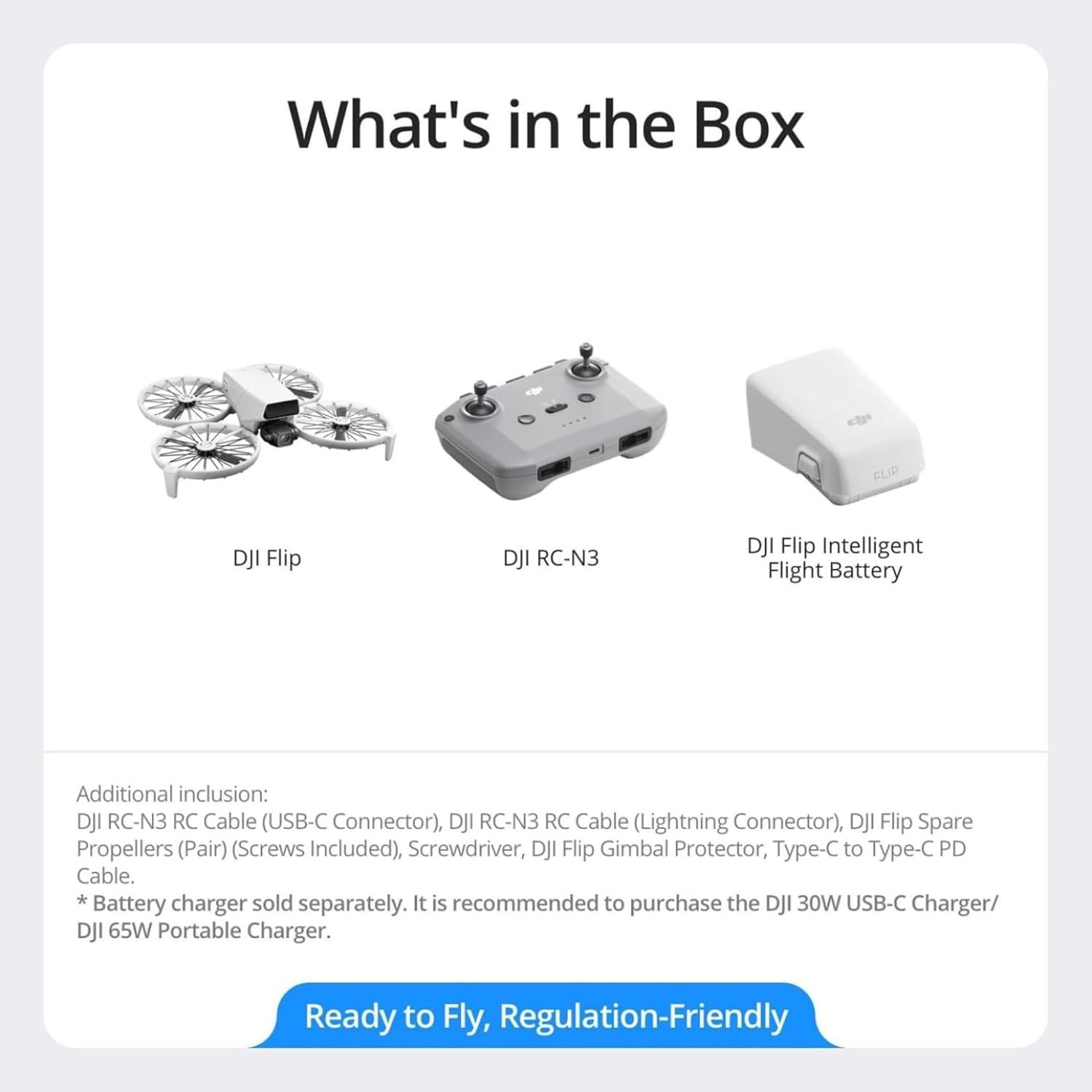 DJI Flip (DJI RC-N3) includes DJI Flip, DJI RC-N3 remote controller, one Intelligent Flight Battery, and more.