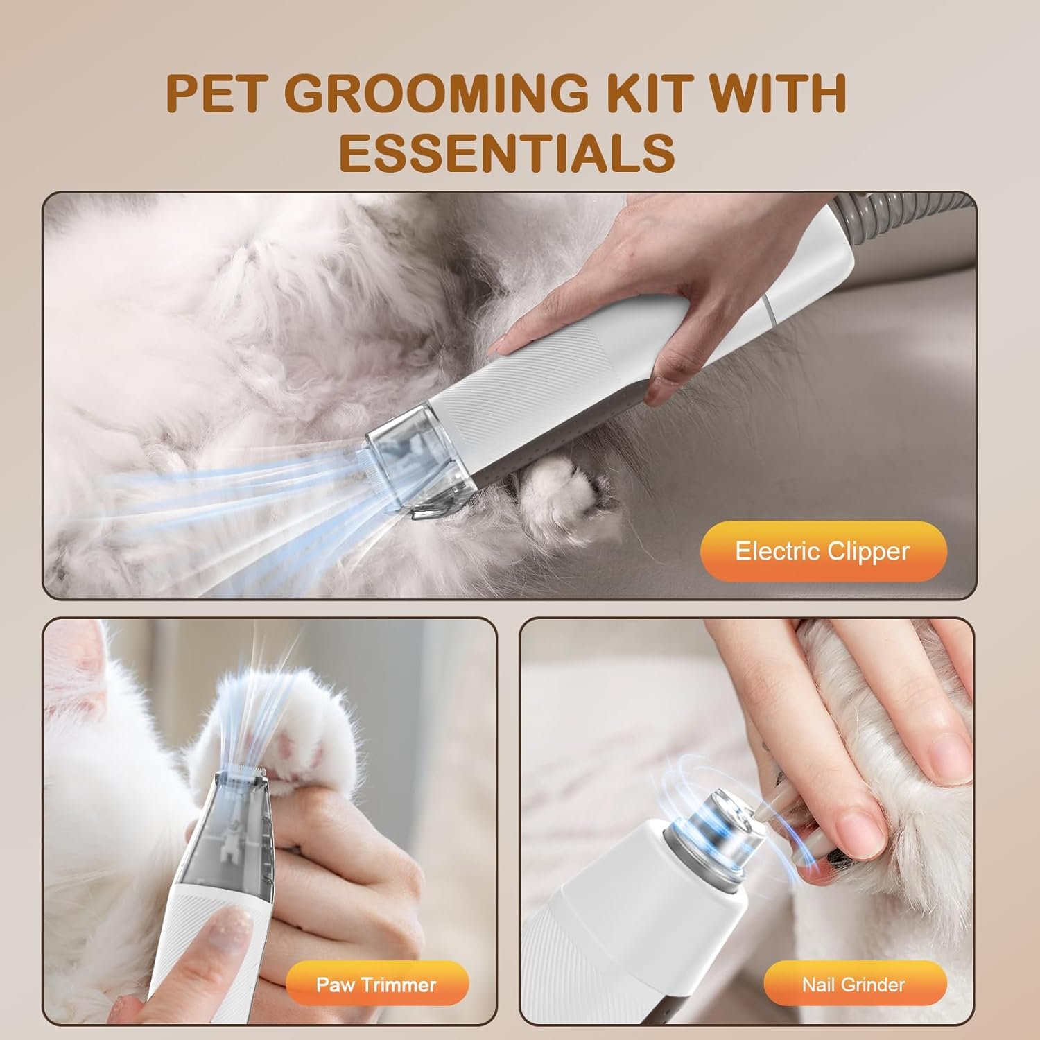🐈7-in-1 Pro Pet Grooming Kit: Complete with perfect accessories for comprehensive pet grooming.Suction and grooming all in one, pet grooming clippers and suction function work simultaneously to remove pet hair and fine dust, keeping everything neat. The Dog paw trimmer and Nail grinder provide excellent cutting, while the Nozzle head offers deep cleaning by effectively sucking out loose hair and dandruff from sofa crevices and carpets.