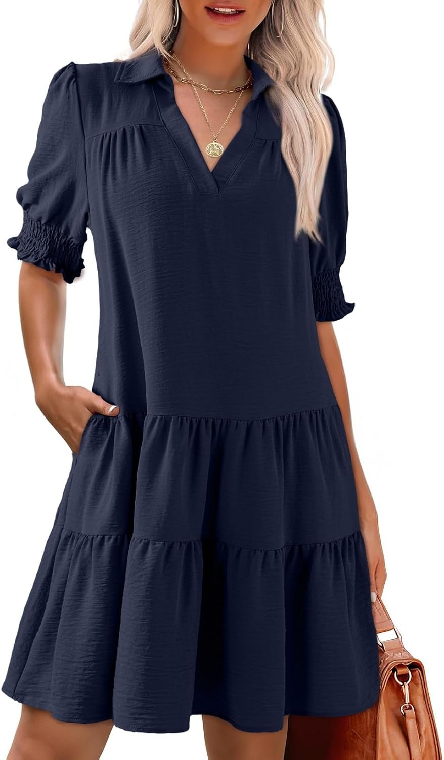 Dokotoo Casual Dresses for Women Lapel Collared V Neck Mid Sleeved Pleated Summer Dresses for Women 2026 Midi Dresses