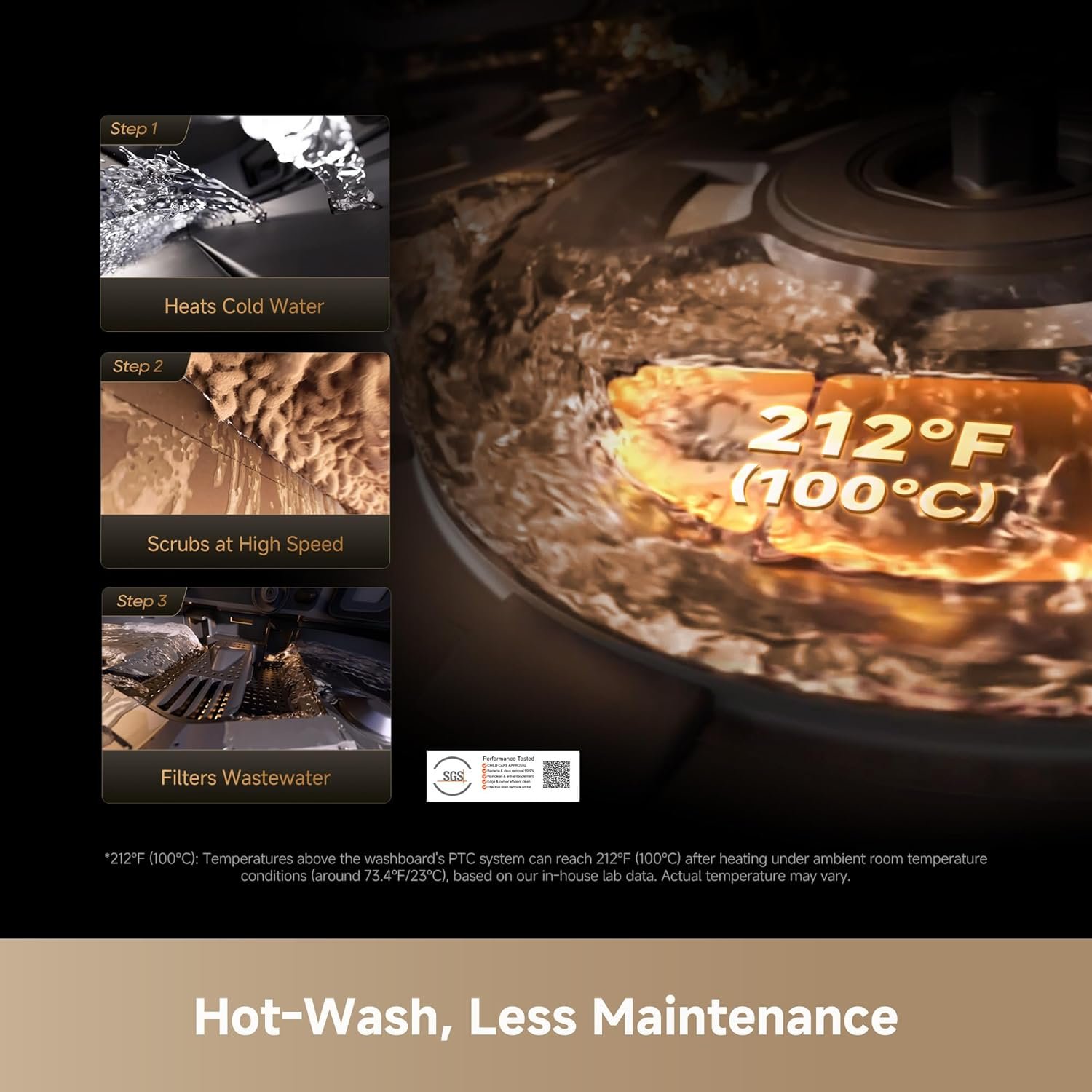 Press, Spin, and Dissolve: Pressing with 15N force and spinning at 230RPM, the dual omni-scrub mop pads work with 104°F (40°C) hot water to deeply clean uneven floors and remove stubborn grease