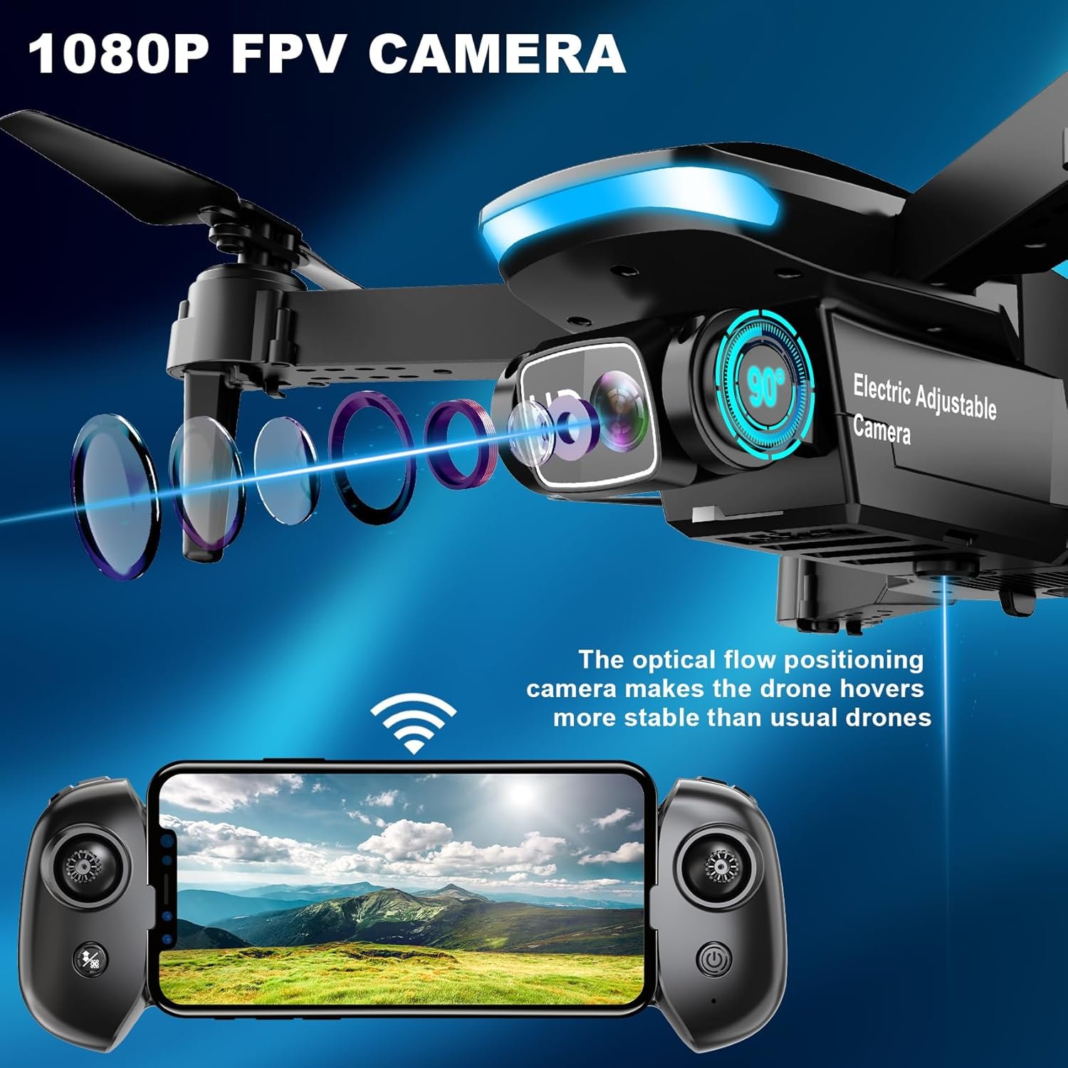 ELECTRIC ADJUSTABLE 1080P HD Camera: This Oddire drone equips an HD 1080P camera, which assists you in catching every wonderful moment from a birds-eye perspective. The camera angle can be adjusted remotely up to 90 degrees. Combined with the upgraded hover system and optical flow positioning technology, the camera drone is more stable when shooting. You can enjoy a real-time panoramic view and share it on your social media with ease.