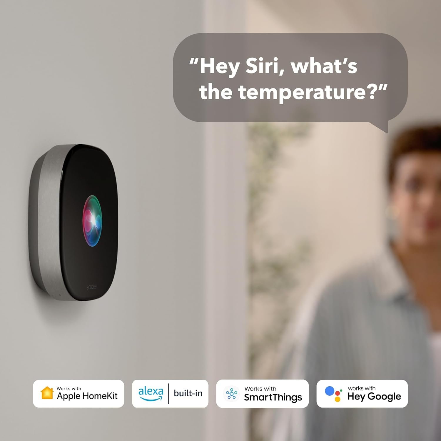 Ecobee Smart Thermostat Premium optimizes comfort while saving energy through superior intelligence and technology. It has a built-in air quality monitor, doorbell Live View, smoke alarm detection, and geofencing technology to understand occupancy. Included SmartSensor eliminates hot and cold spots and adjusts the temperature in the rooms that matter most. Works with Siri*, Alexa, Google Assistant, HomeKit, and SmartThings. *Apple home hub required to enable Siri.
