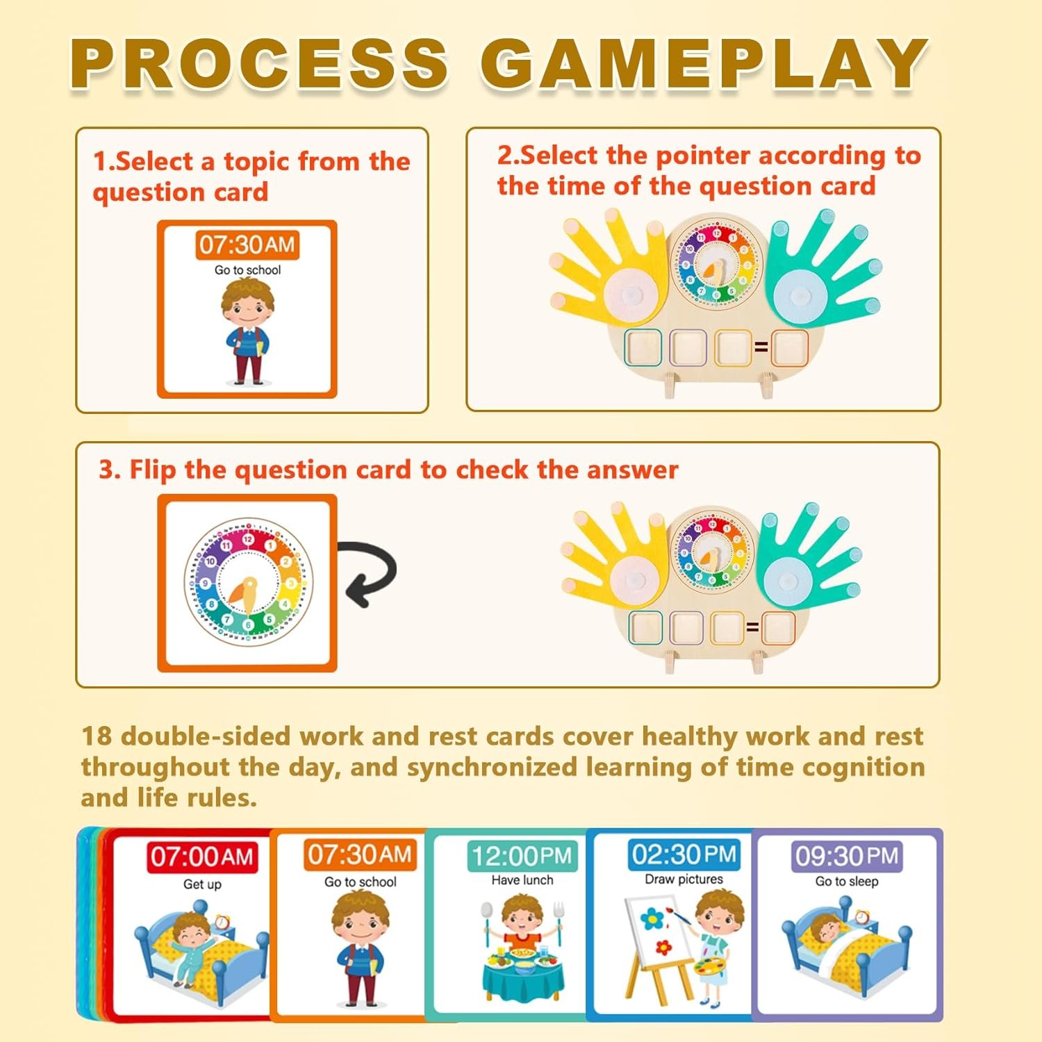 [Children’s teaching clock]: Still worrying about children’s confusion about “what time”? Teaching clocks for kids aged 3-6 helps children to establish time concept and develop regular work and rest through fun interaction. With scene cards such as “get up at 7:00 AM”, the children dial the pointer to match and understand the time-sharing relationship. It can reduce the delay and lay the foundation for entering the park,making it an excellent homeschool toy.