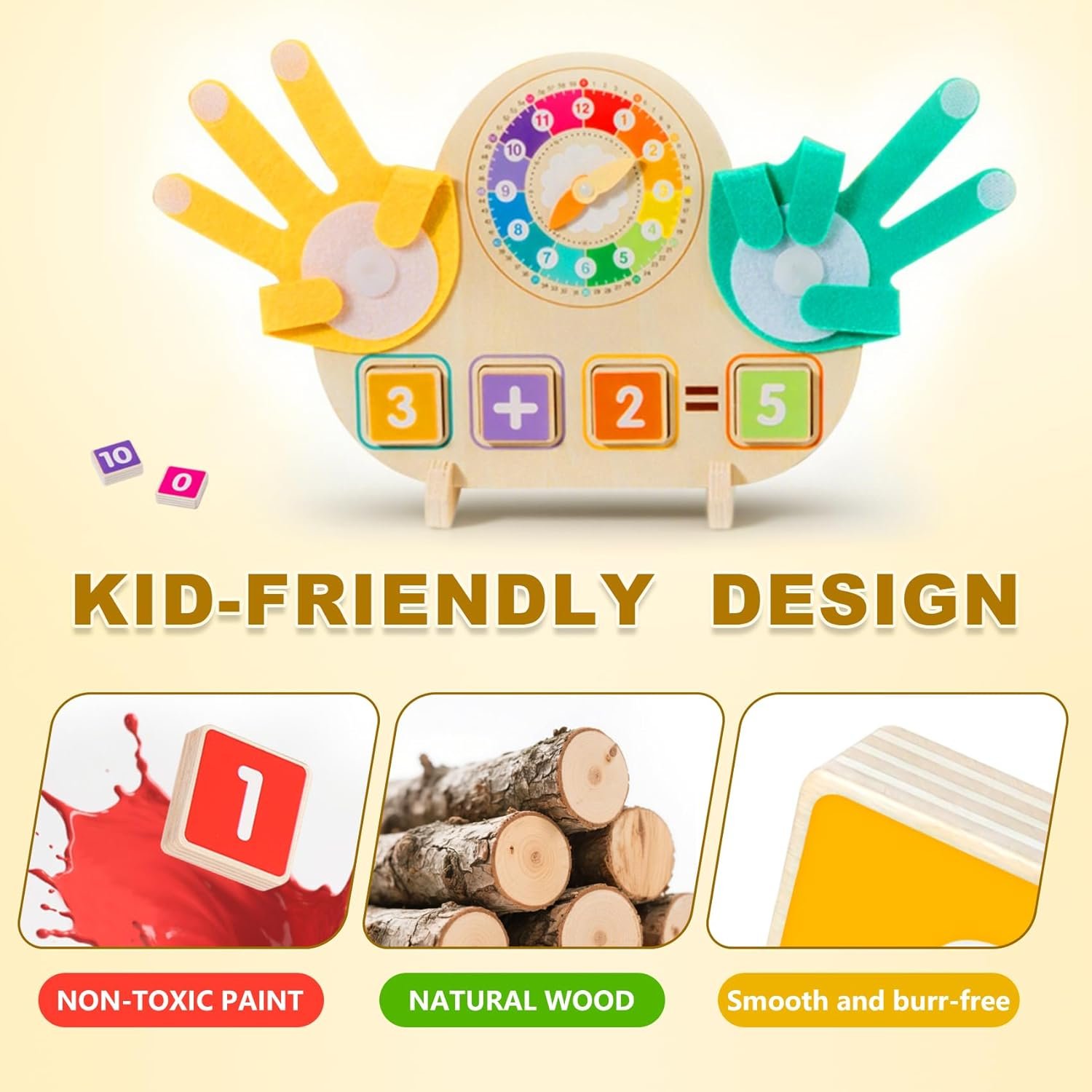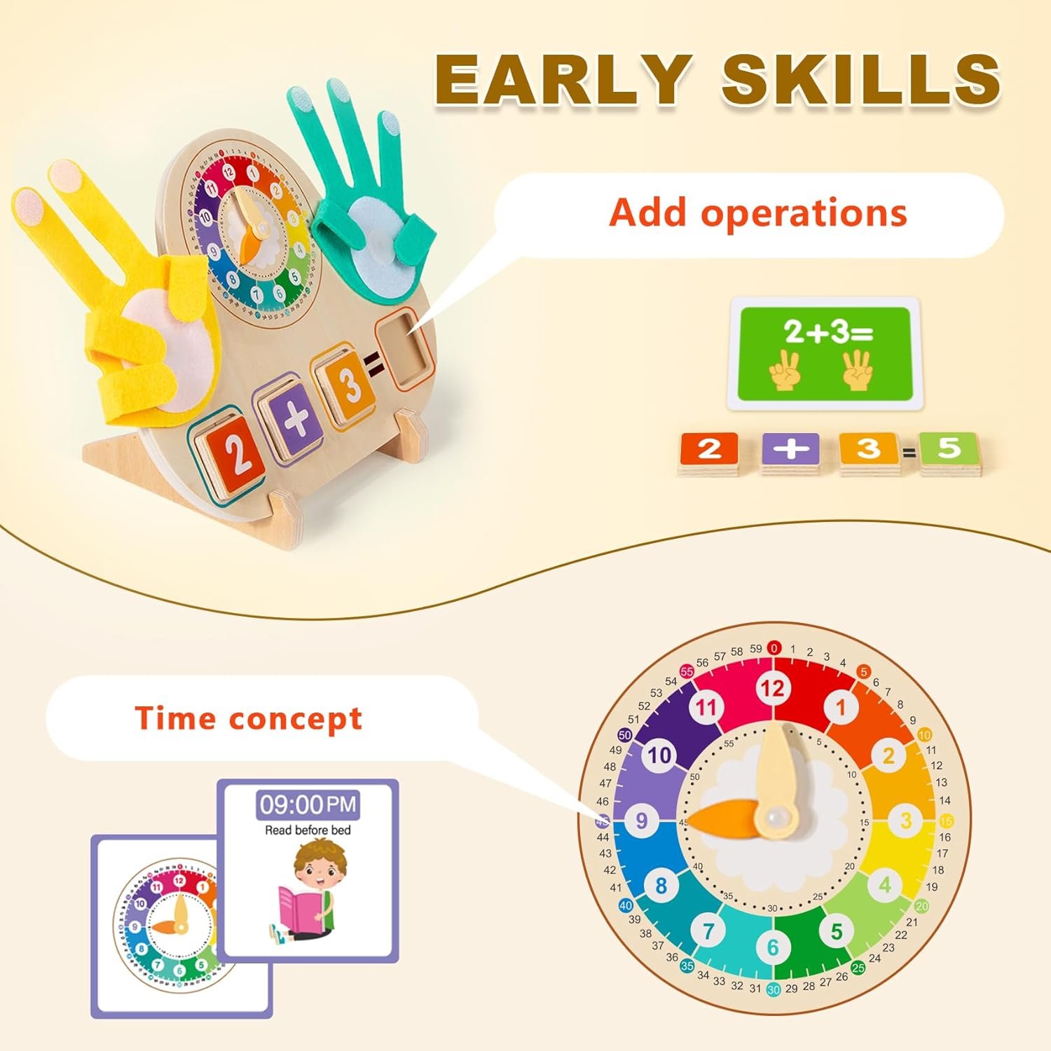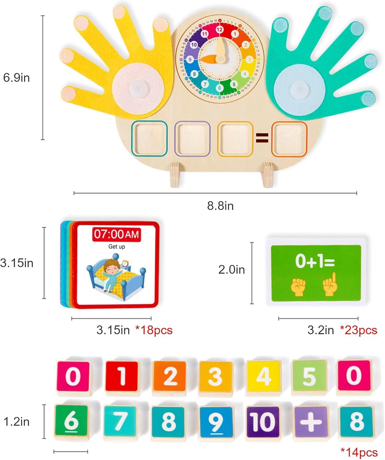 [Rich Components]: The set includes 14 colored number blocks, 23 double-sided arithmetic cards, and 1 display stand, which help with number recognition and calculation; a 12-hour format clock with movable hands and 18 time-teaching cards strengthen the concept of time through contextual scenarios. Integrating mathematics, time, and number cognition, it meets the diverse learning needs of children aged 3-6.