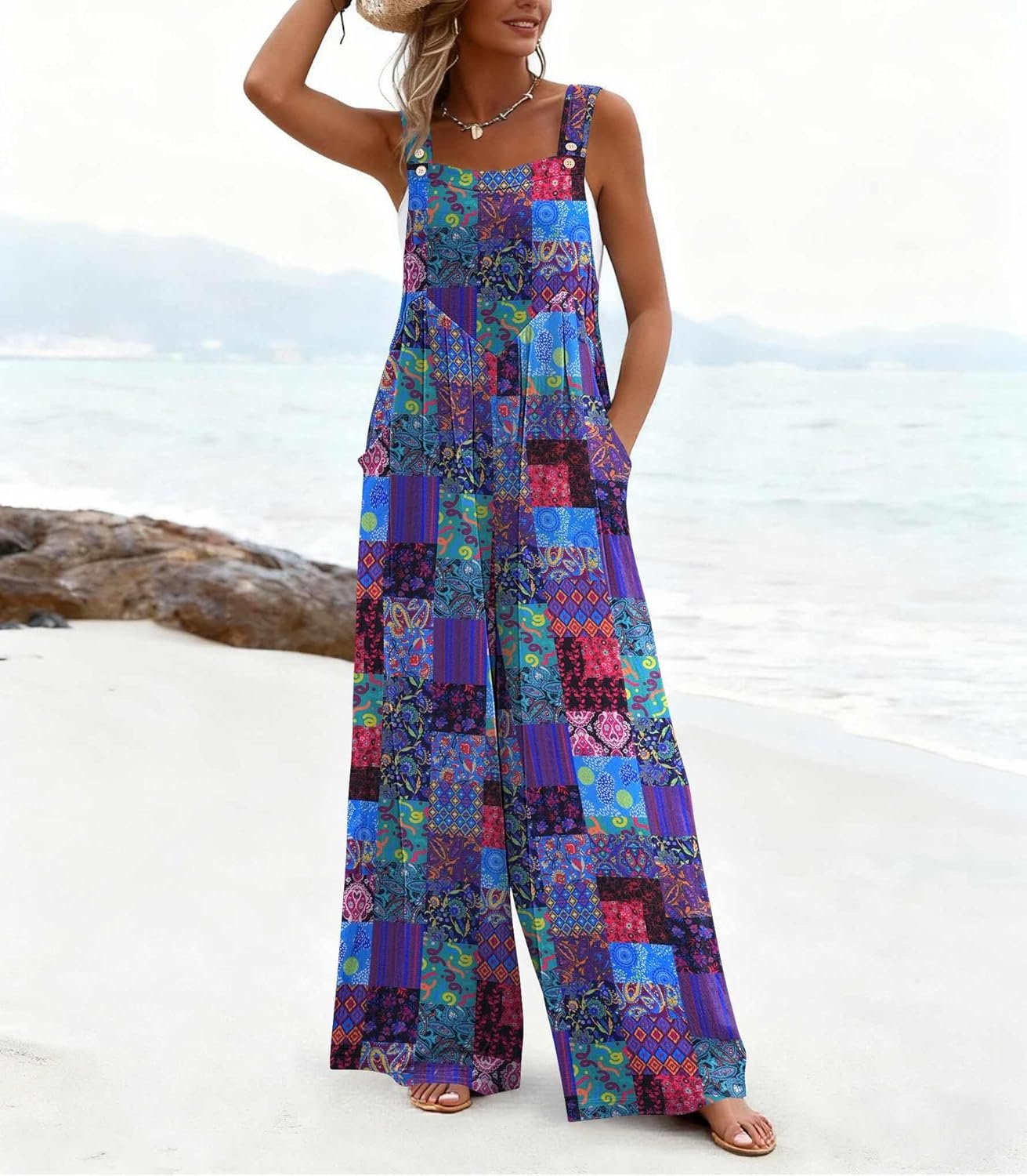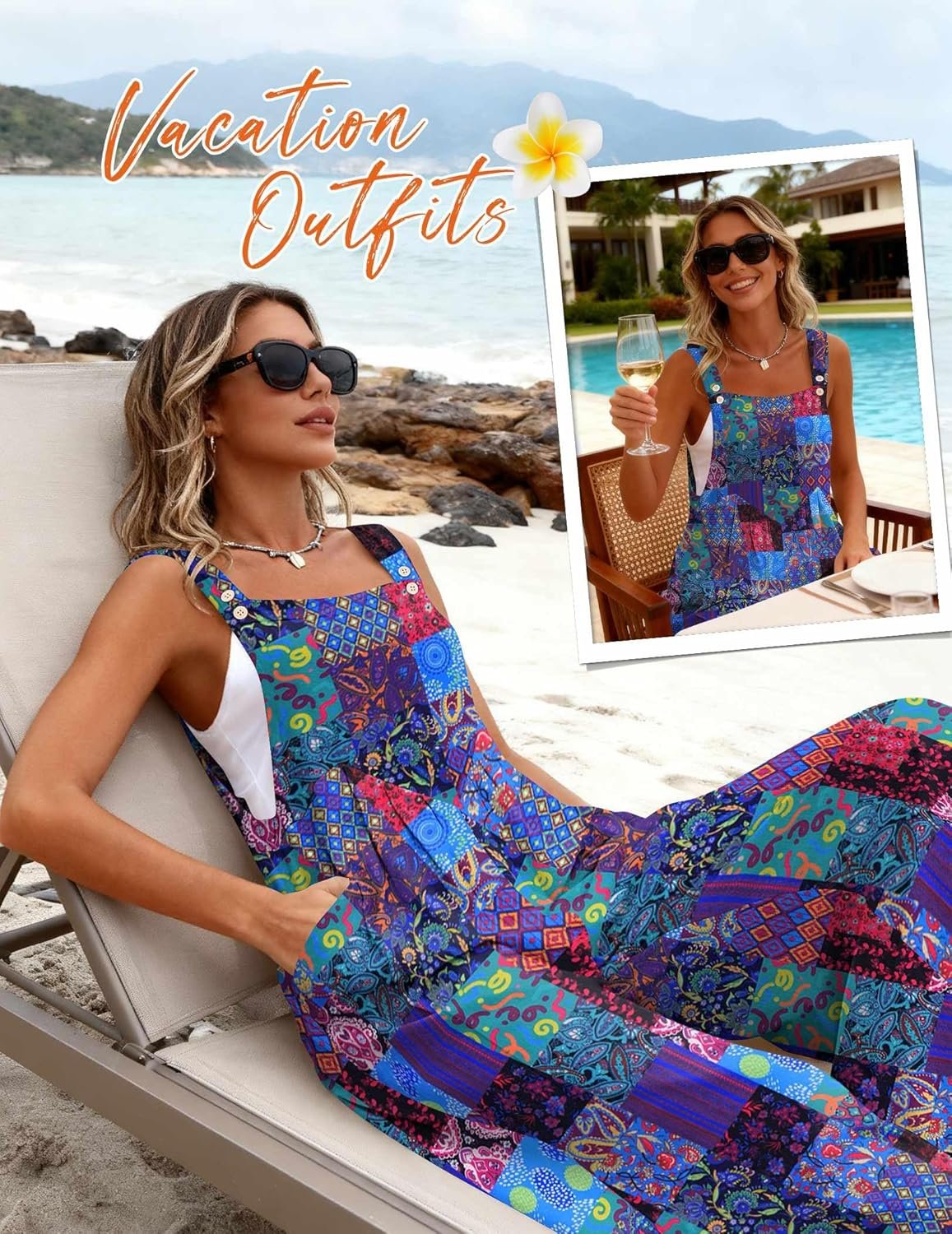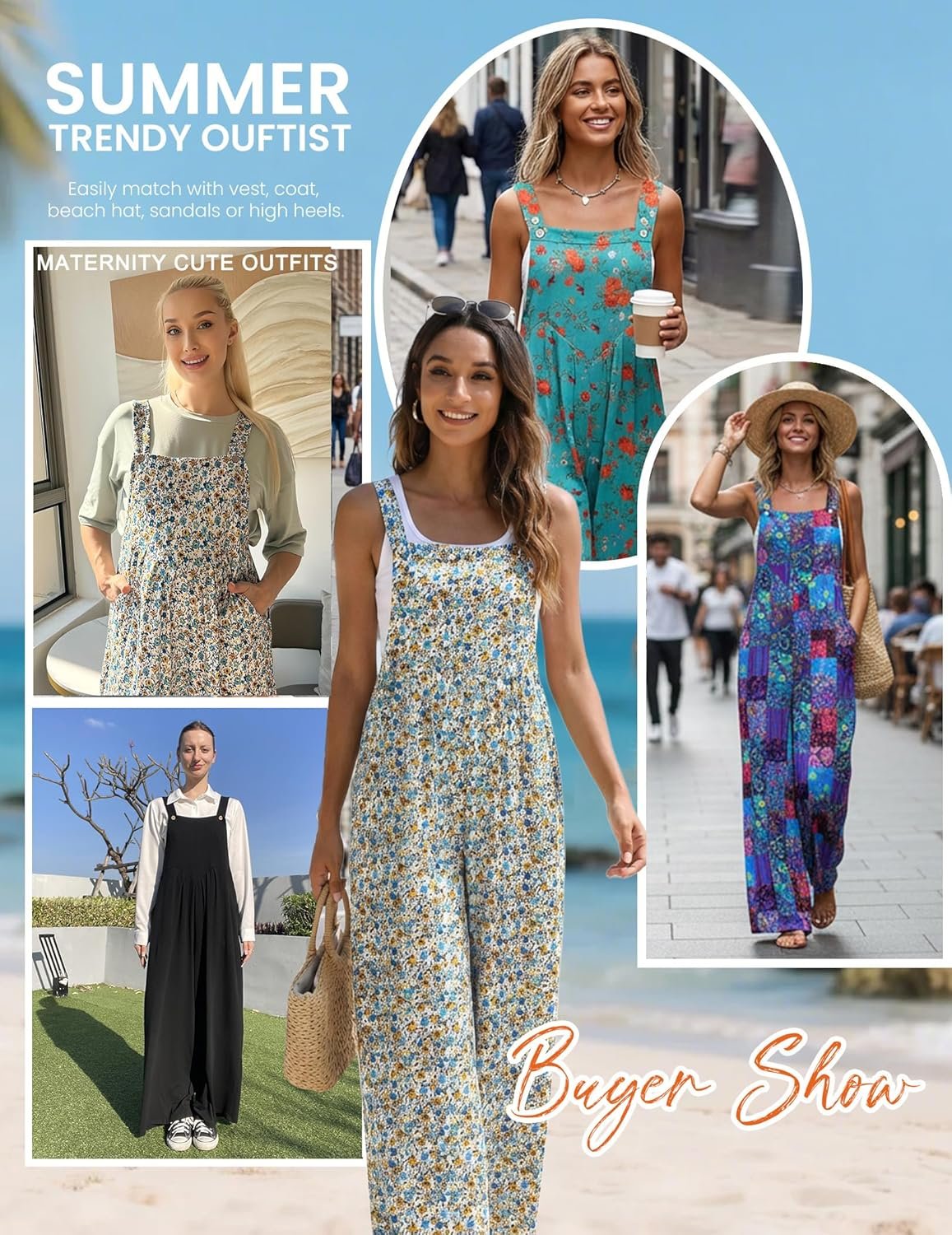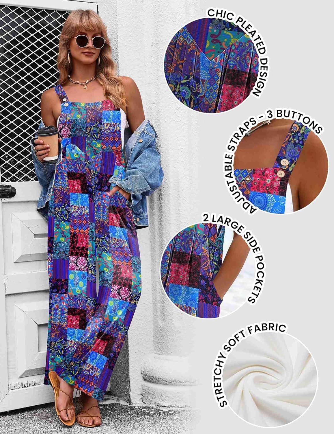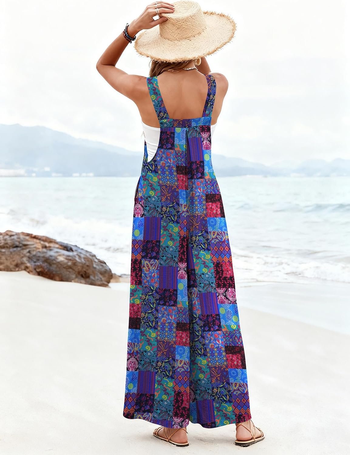 Ekouaer Women’s Casual Overalls Loose Wide Leg Jumpsuits Summer Boho Floral Printed Baggy Rompers with Pockets