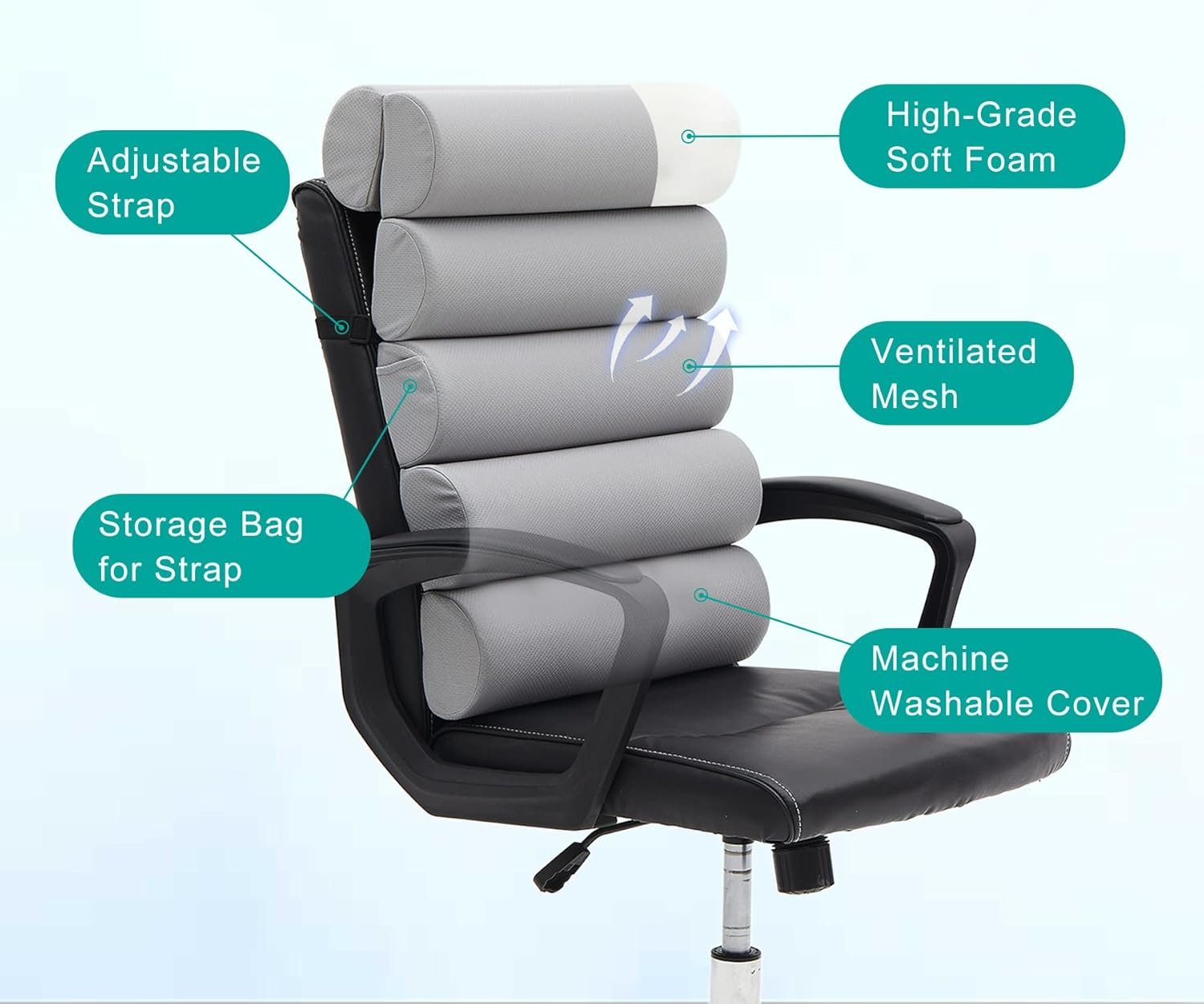 【OFFICE CHAIR BACK SUPPORT PILLOW UNIQUE DESIGN】:Givanlee unique design of flexible high back pillow is different from many other lumbar cushions,this patented back pillow is made from a combination of 6 semi-circular columns.As this feature, this adjustable pillow can be adjusted to the pillow you want and relieve your neck,upper,mid and lower back pain and back tightness.