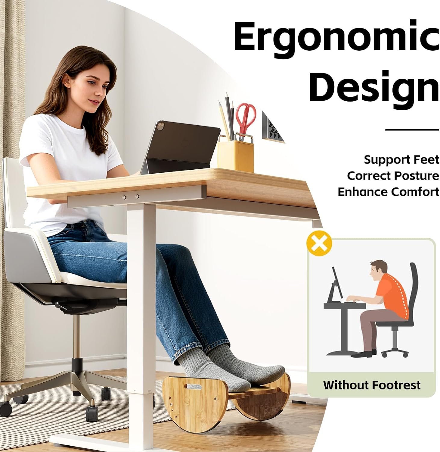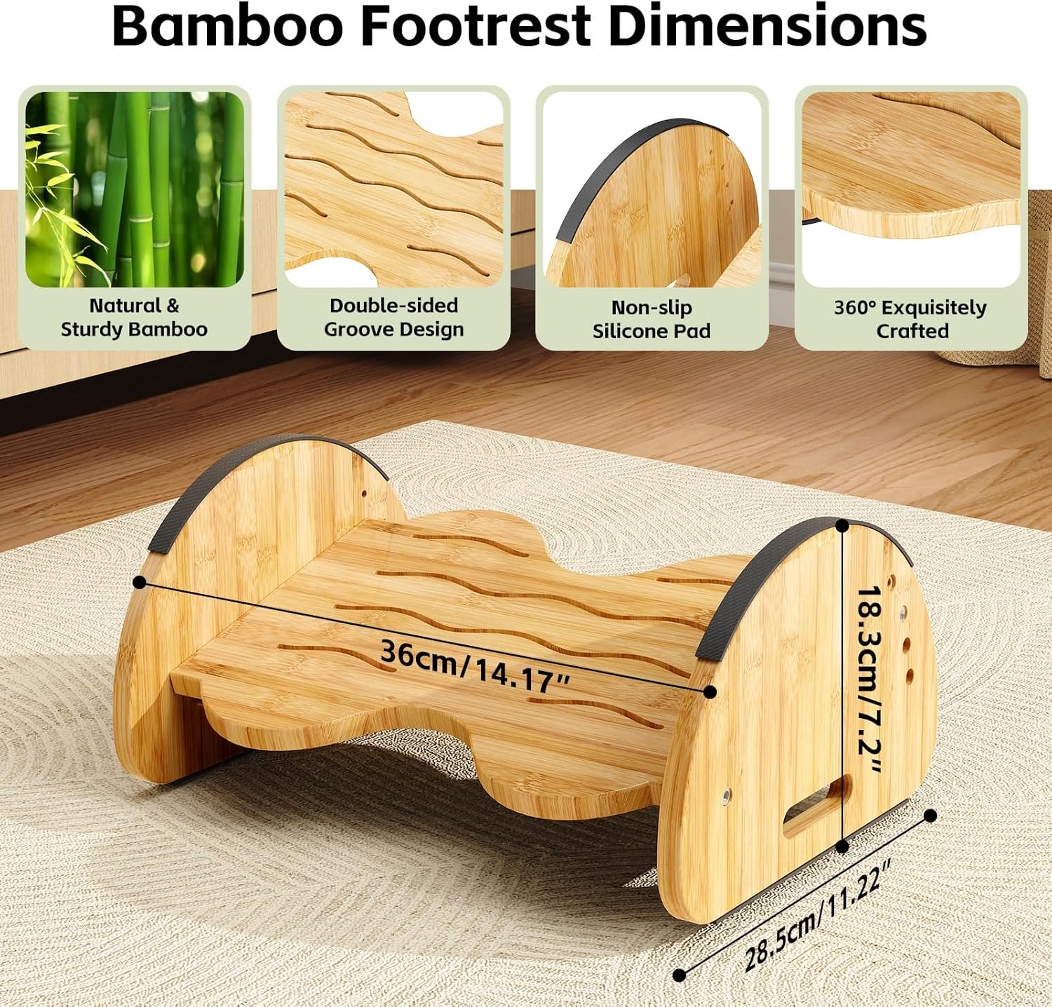 Adjustable footrest & durable: Our under-desk footrest is made from high-quality natural bamboo, ensuring durability and preventing breakage unlike plastic footrests. It can support up to 400 pounds. Each footrest is equipped with a non-slip bottom to prevent sliding or rolling, providing a secure grip and stability. Golden ratio curved design provides smoother rocking while maintaining a sleek appearance. You can easily tilt forward and backward to find the optimal comfort and support.