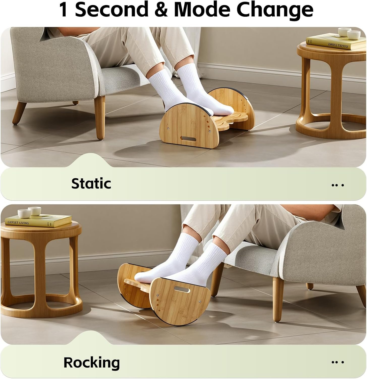2-in-1 dual-use design: When you’re torn between a rocking footstool and a static footstool, the Kabet Bamboo Footstool has you covered. Simply flip the legs over to enjoy a fresh, new experience, offering multi-angle forward and backward rocking as well as a fixed footstool. A harmonious blend of fashion, comfort, practicality, and eco-friendliness