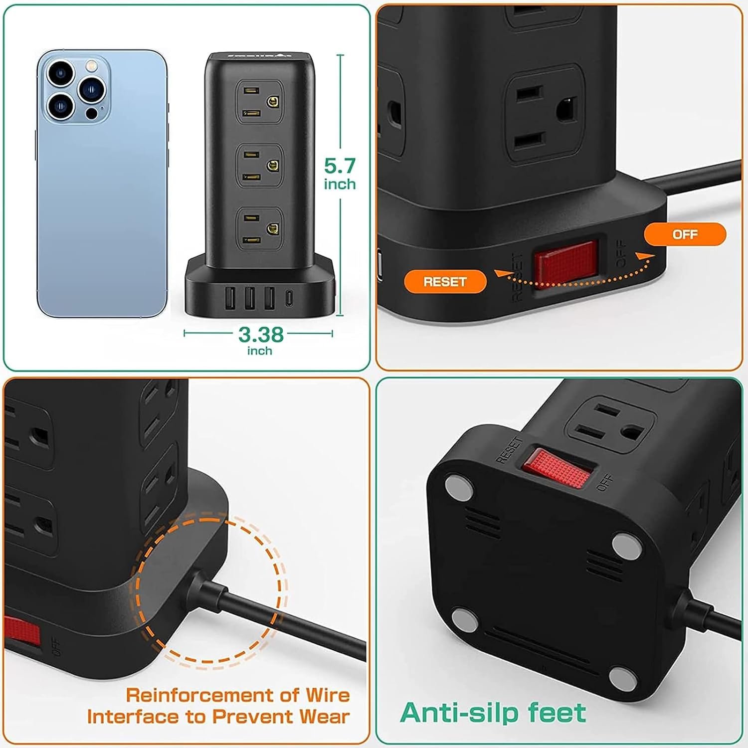 Power strip tower thicked broadened base with anti-slip mat on the bottom make the power strip town steadier, preventing wobbling and sliding around.