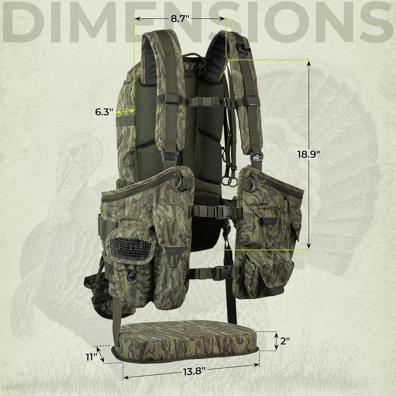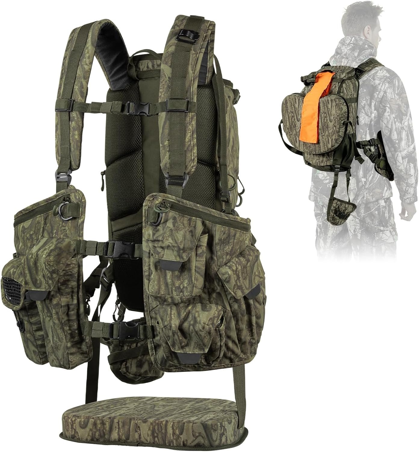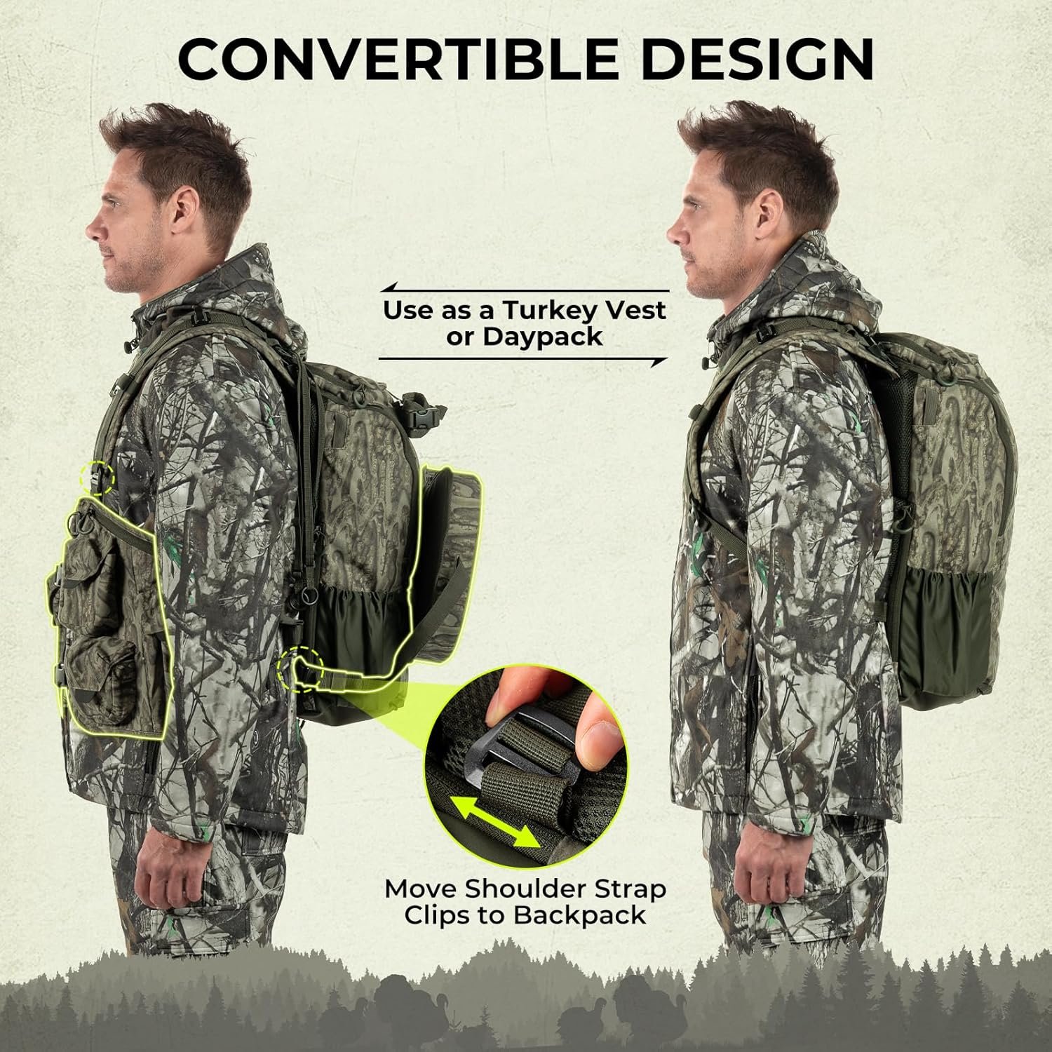 True Convertible Vest-to-Daypack System – Remove the seat and the waistband (with pockets), then attach the shoulder straps directly to the backpack section for a streamlined daypack—ideal for scouting, run-and-gun turkey hunting, and covering ground when you don’t need the full vest layout.