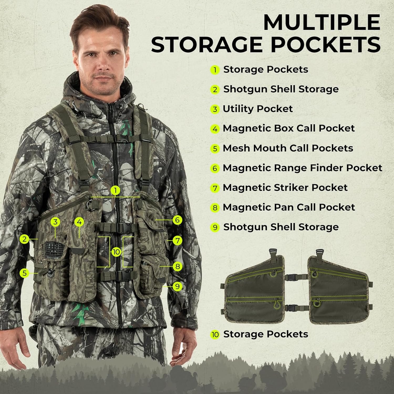 Turkey-Ready Storage & Call Organization – Built for serious turkey hunters, the Extremus BearHauler Turkey Vest features two oversized rear pouches plus dedicated pockets for pot/pan calls, box calls, mouth calls, strikers, rangefinder, shotgun shells, hydration, and small accessories like your phone, license, and keys—so your gear stays organized and ready fast.