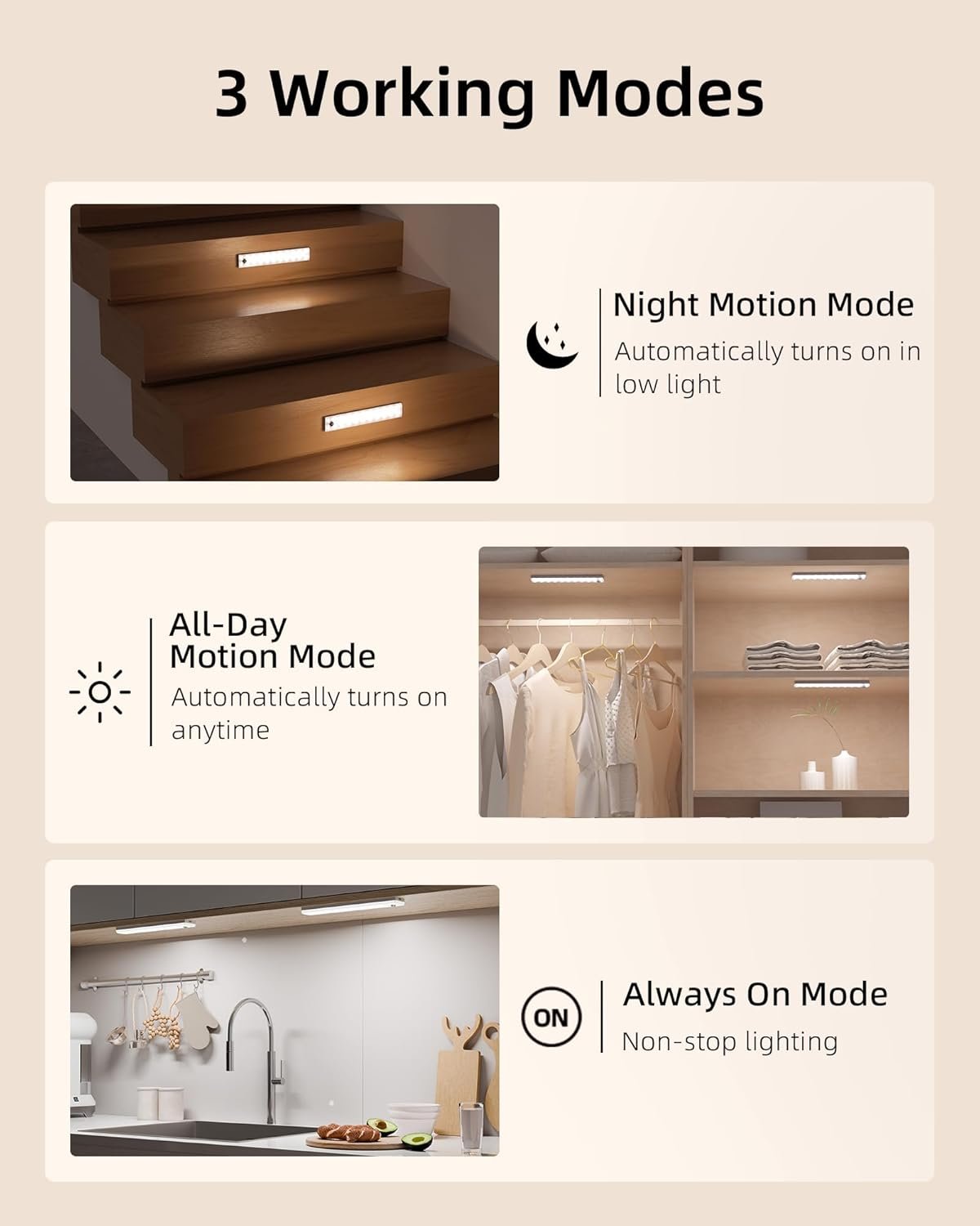 Three Modes for Every Need: The motion sensor light detects motion within 10 ft and a 120° field, automatically turning on and off after 20 seconds of no movement. [Night Motion Mode] activates in darkness or low light, perfect for late-night use—no more stumbling for the switch. [All-Day Motion Mode] works anytime motion is detected, ideal for dim areas where your main lights don’t reach. [Always-On Mode] provides continuous illumination for long tasks and can also be used as a flashlight or during power outages and camping.
