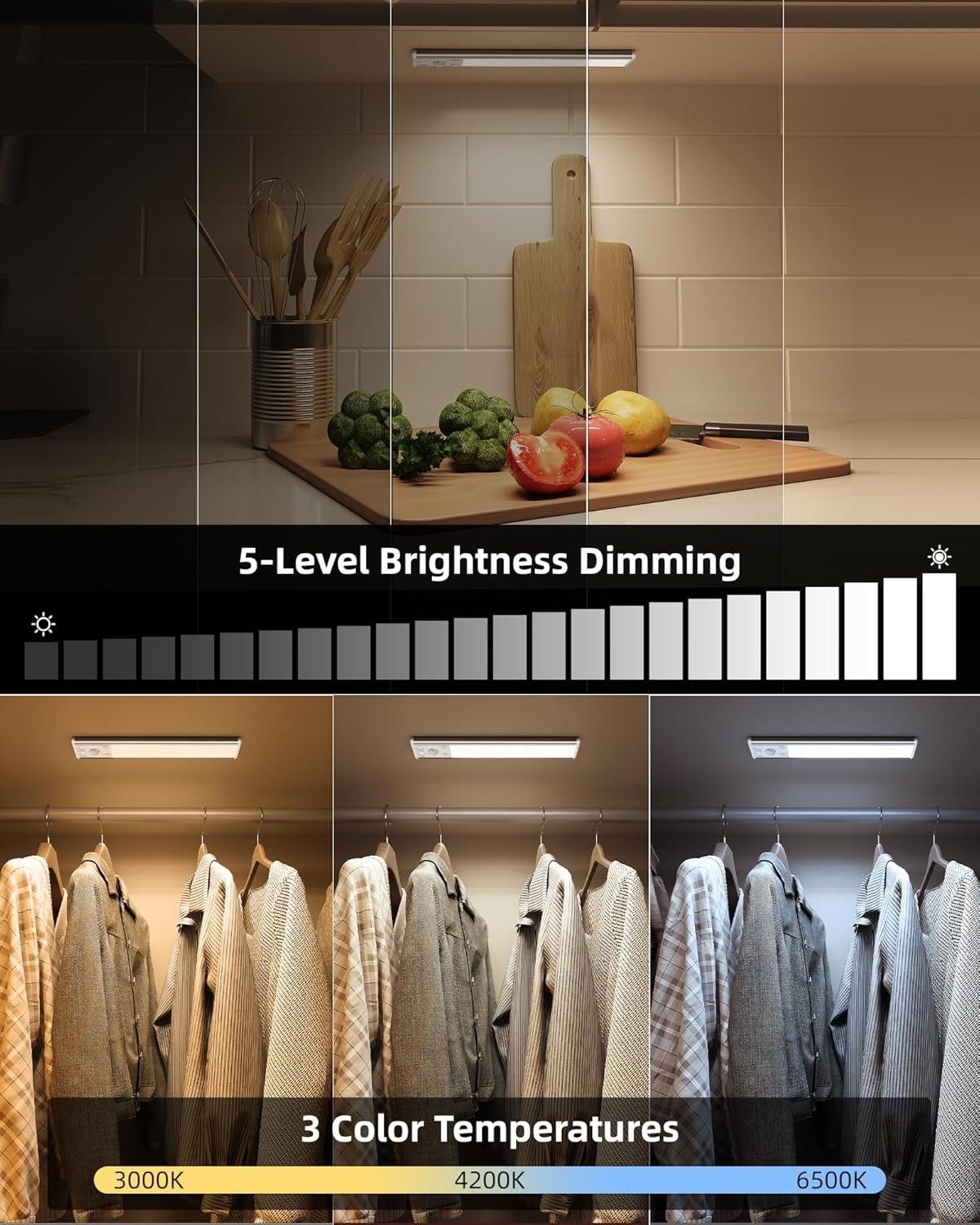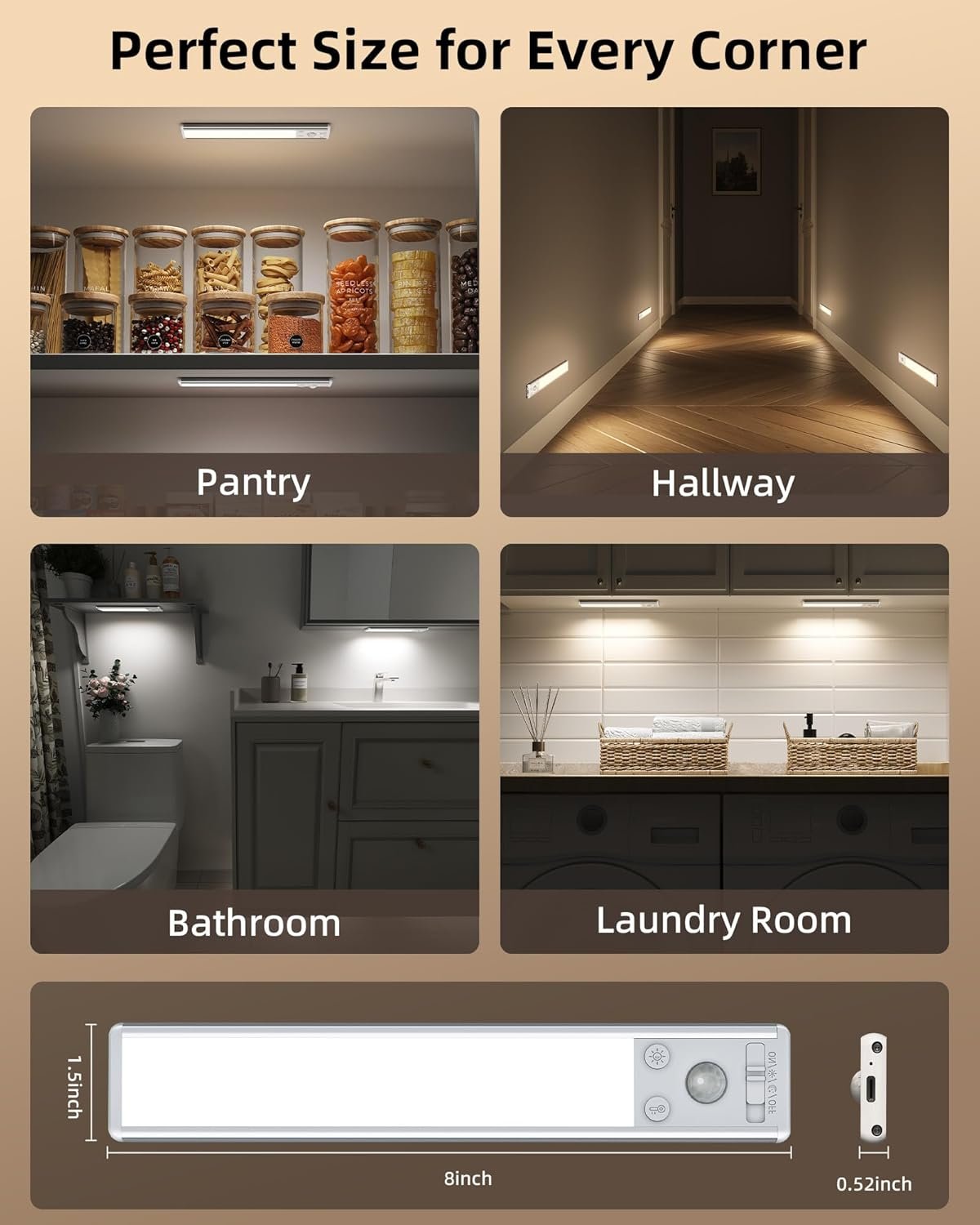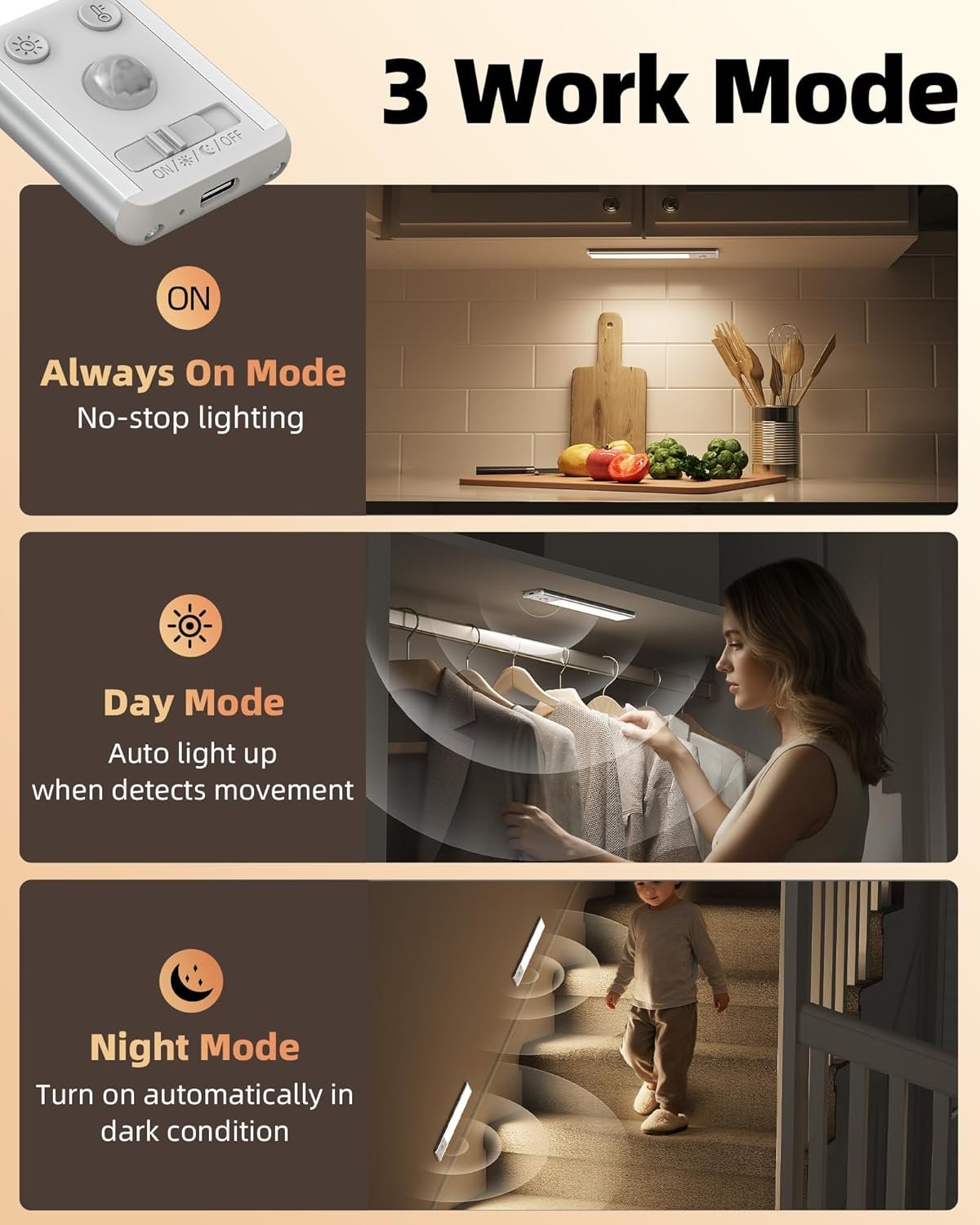 Long-Lasting Performance with 2400mAh Battery & Quick USB-C Recharge: In motion-activated Auto Mode, each light lasts 15–40 days per charge; in Always-On Mode at 100 % brightness, up to 11.5 hours. Powered by a durable 2400 mAh rechargeable battery, it fully recharges in only 2.5 hours. Reliable, energy-efficient lighting for kitchens, closets, or anywhere.