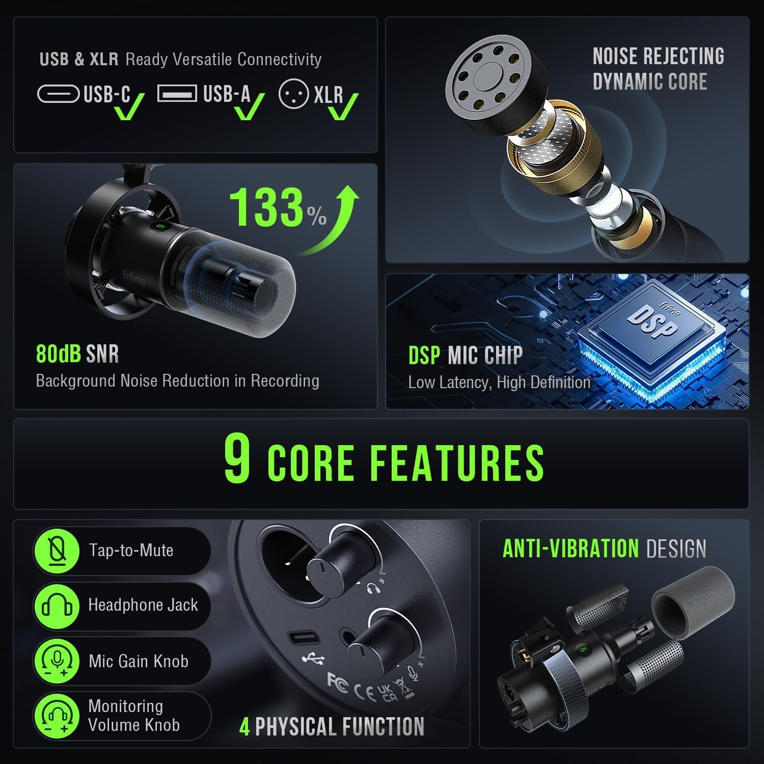 FIFINE K688 Podcast Microphone Kit, USB/XLR Dynamic Microphone with Boom Arm for PC/XLR Mixer, Gaming Mic with Mute Button, Headphone Jack for Vocal, Voice-Over, Streaming, Music Recording -K688CT