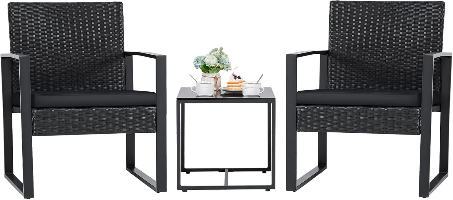 Flamaker 3 Pieces Outdoor Patio Wicker Furniture Set, Modern Rattan Chair Conversation Sets with Coffee Table for Yard and Bistro (Black)