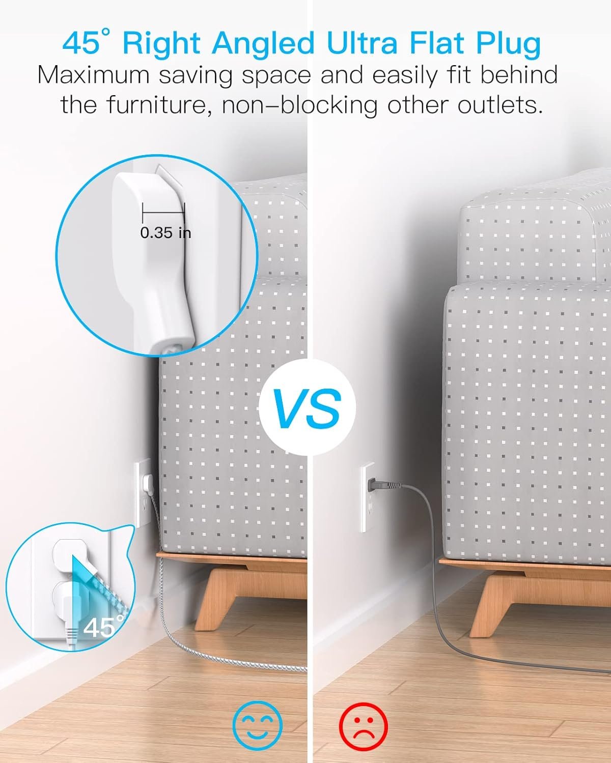 The 45-degree right-angled thin flat plug makes it easily to plug in and out behind the furniture, and will not block the bottom receptacle of your duplex wall outlet and frees up the receptacles for other uses.