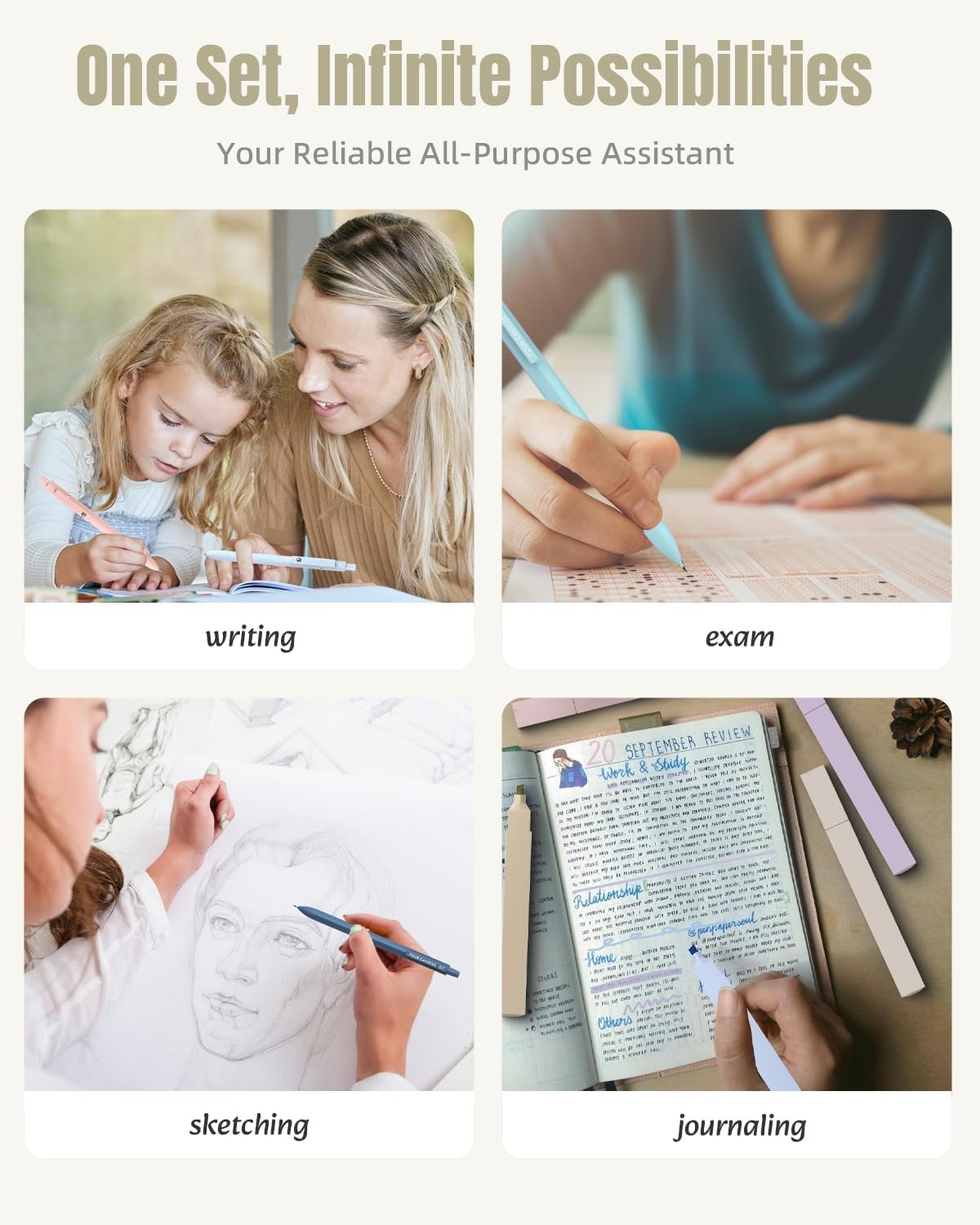 All-in-One Bulk Pack: This pack includes 12 pastel colored highlighters, 6 adorable mechanical pencils, 5 black ink gel pens, 5 gel pen refills, a charming pink pencil pouch, 3 jelly erasers, 9 cap erasers, and 6 tubes of lead refills; It’s the ultimate collection of multifunctional stationery essentials for office and school supplies