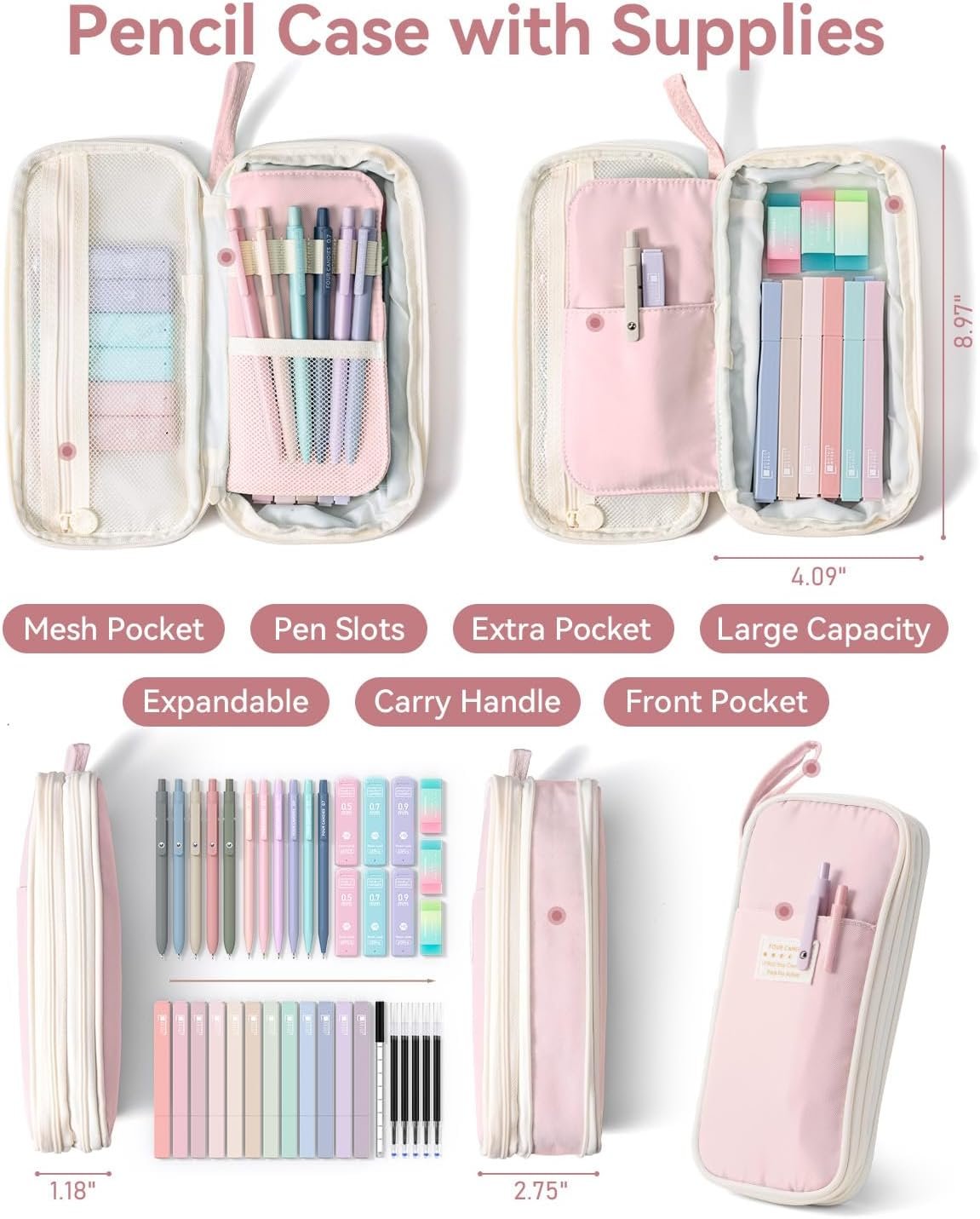Four Candies 39 PCS Aesthetic School Supplies with Cute Pen Case, 12 Pastel Highlighters, 5 Black Ink Gel Pens, 6 Mechanical Pencils Set for Students Stationary College Essentials (Pink)