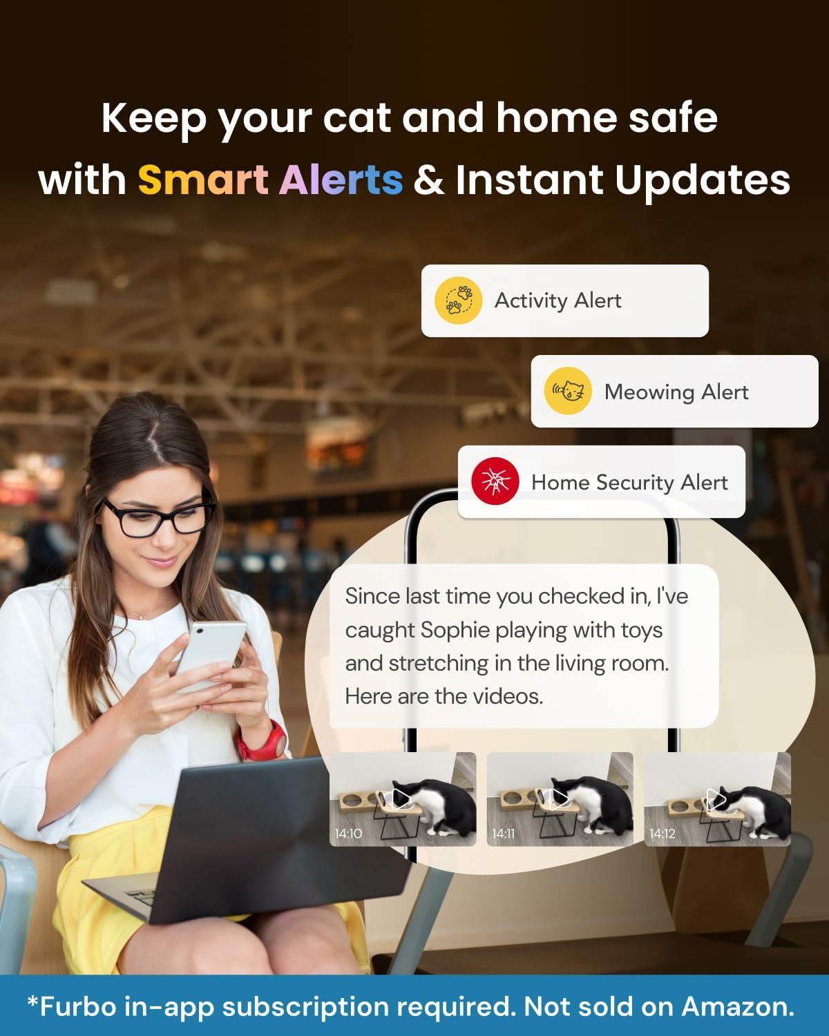 PEACE OF MIND AT HOME: Designed to watch over your pet, Furbo Nanny sends real-time alerts and smart insights, plus includes 3–7 days of video history so you can review what you missed. With continuous feature updates, it evolves to better understand your pet. (Important: This camera requires a paid subscription to Furbo Nanny.)