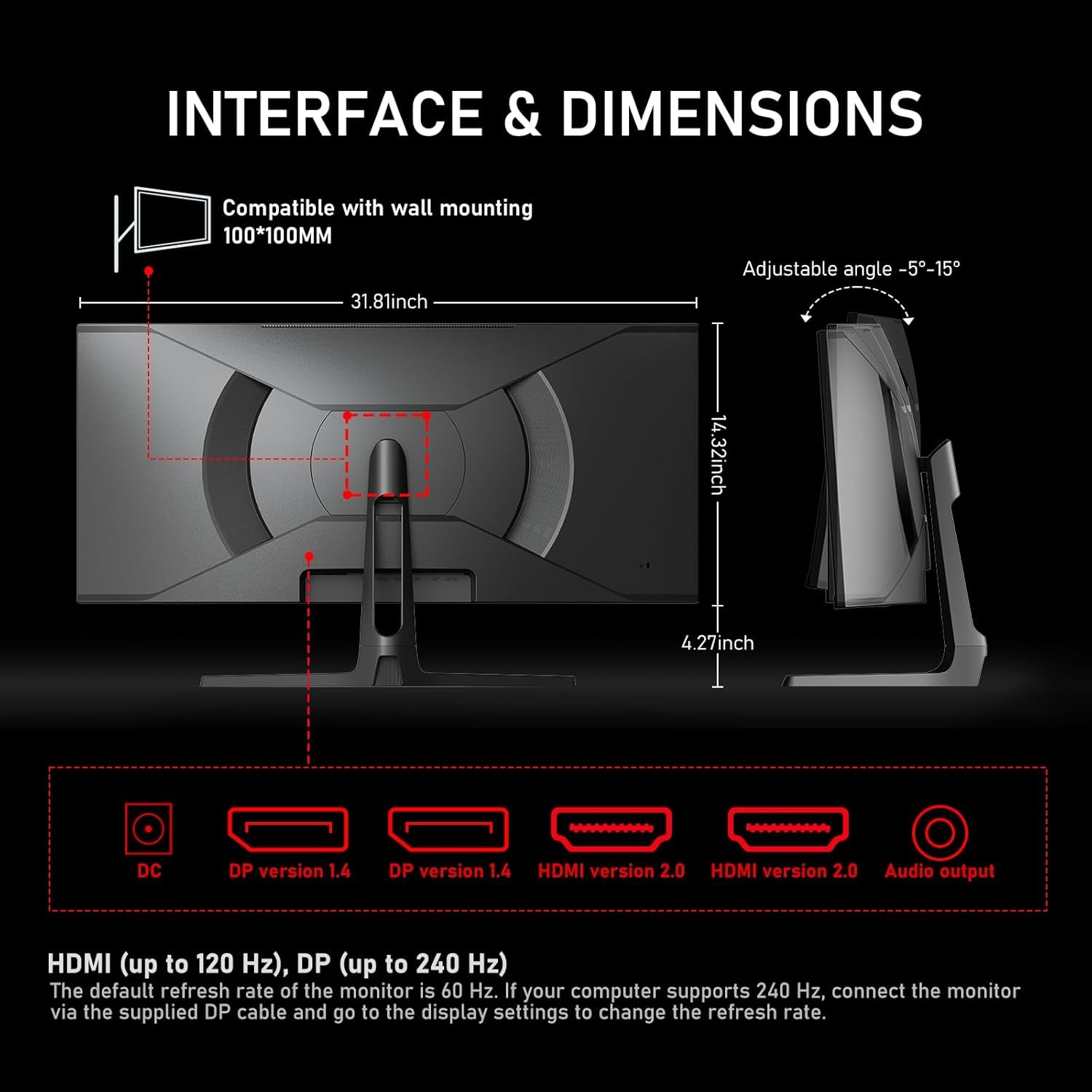 Versatile Connectivity and Convenience – Equipped with dual HDMI 2.0 and dual DP 1.4 ports, this 34 inch Ultrawide monitor offers flexible connection options for a variety of devices, from gaming PCs to consoles. It also includes built-in speakers for convenience and an earphone jack for private listening. For ergonomic setup, the monitor supports tilt adjustment and is VESA wall mount compatible (100x100mm)