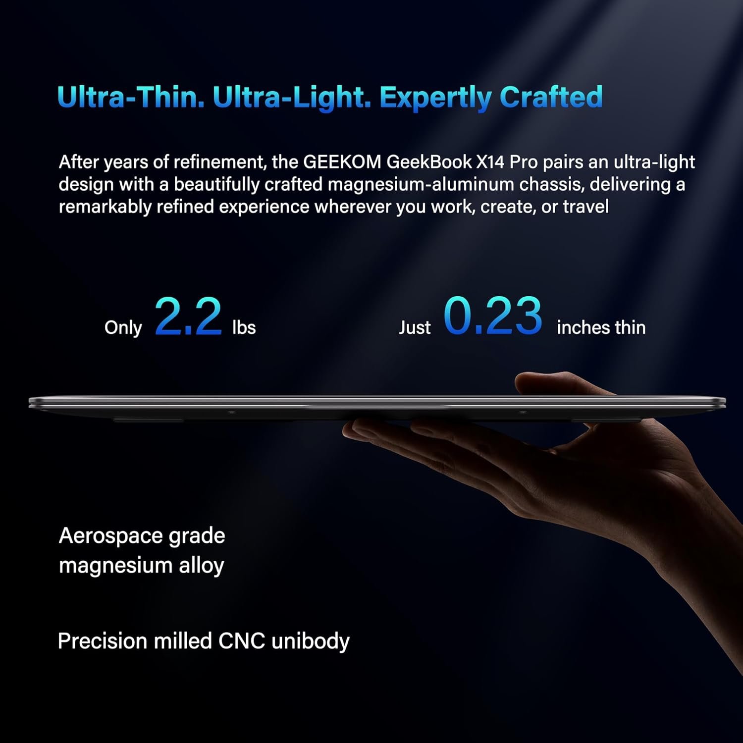 🪶[Featherlight, All-Metal, All In] At just 2.2 lbs and 0.23 inches thick, the Titanium Gray GeekBook X14 Pro slips easily into your bag and won’t weigh you down—even when you’re on the move all day. Its chassis is made from aerospace grade magnesium alloy, and the precision-milled CNC unibody gives it a clean, solid feel. A careful multi-step coating adds a smooth, warm finish (not the cold, harsh feel of many metal notebook) and helps reduce smudges and fingerprints. Every line and curve is thoughtfully refined, so it looks clean and modern on your desk and feels just as good in your hand