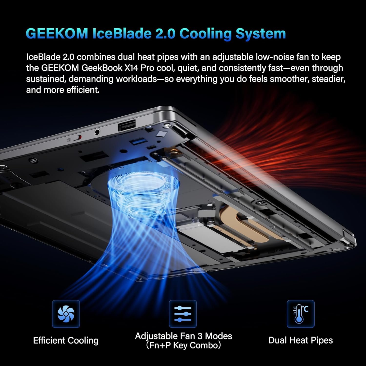 ❄️[Strong and Quiet] The GEEKOM GeekBook X14 Pro delivers the power you need while staying cool. Its advanced IceBlade 2.0 thermal system keeps performance steady during demanding tasks—at whisper-quiet levels. High-efficiency heat pipes pull heat away from the CPU and GPU quickly to reduce thermal throttling and maintain smooth performance over long sessions. The result is a laptop that stays responsive and ready for whatever your day brings. And when it’s time to focus or unwind, dual speakers with DTS:X Ultra audio deliver rich, immersive sound—so you hear more of your content and less of the fans