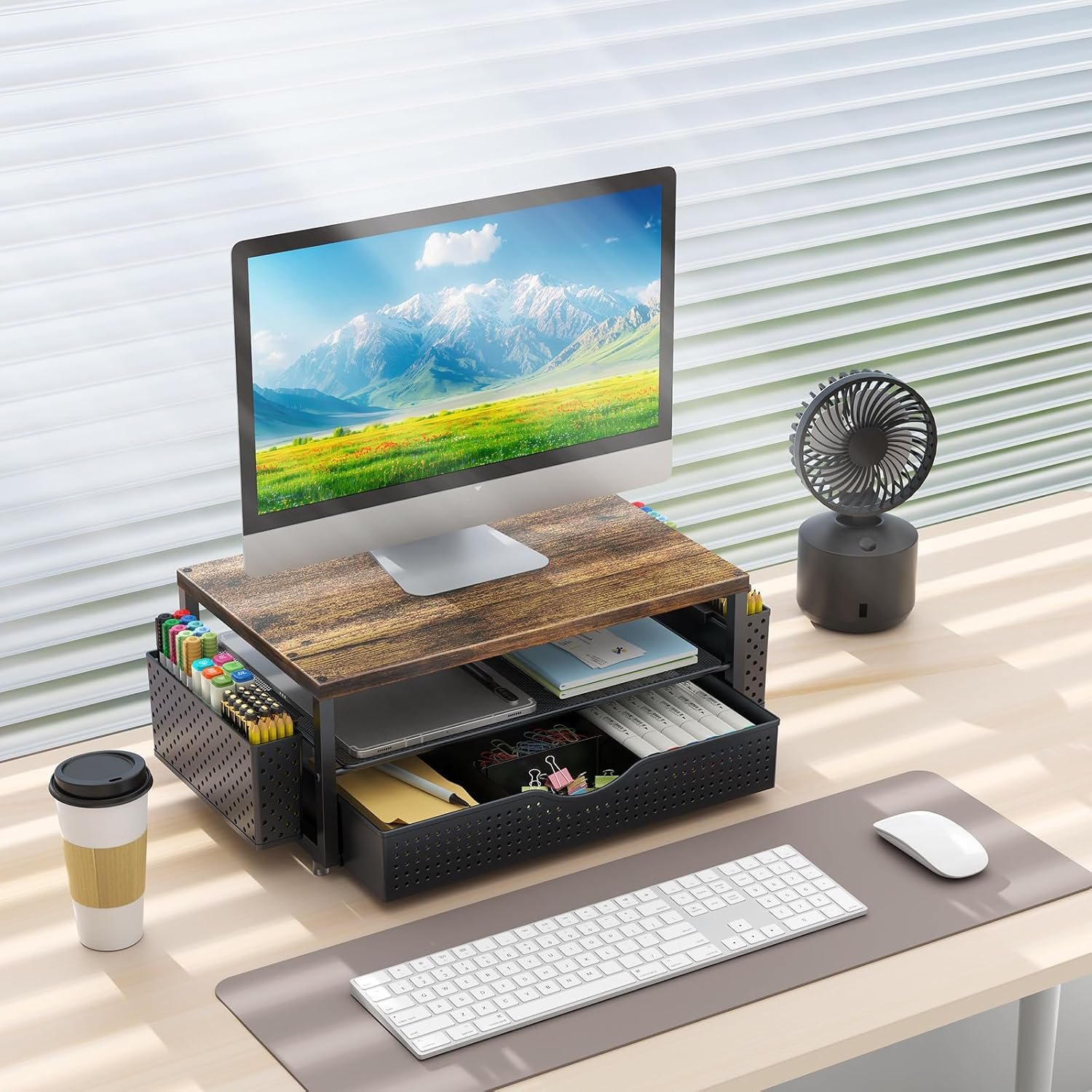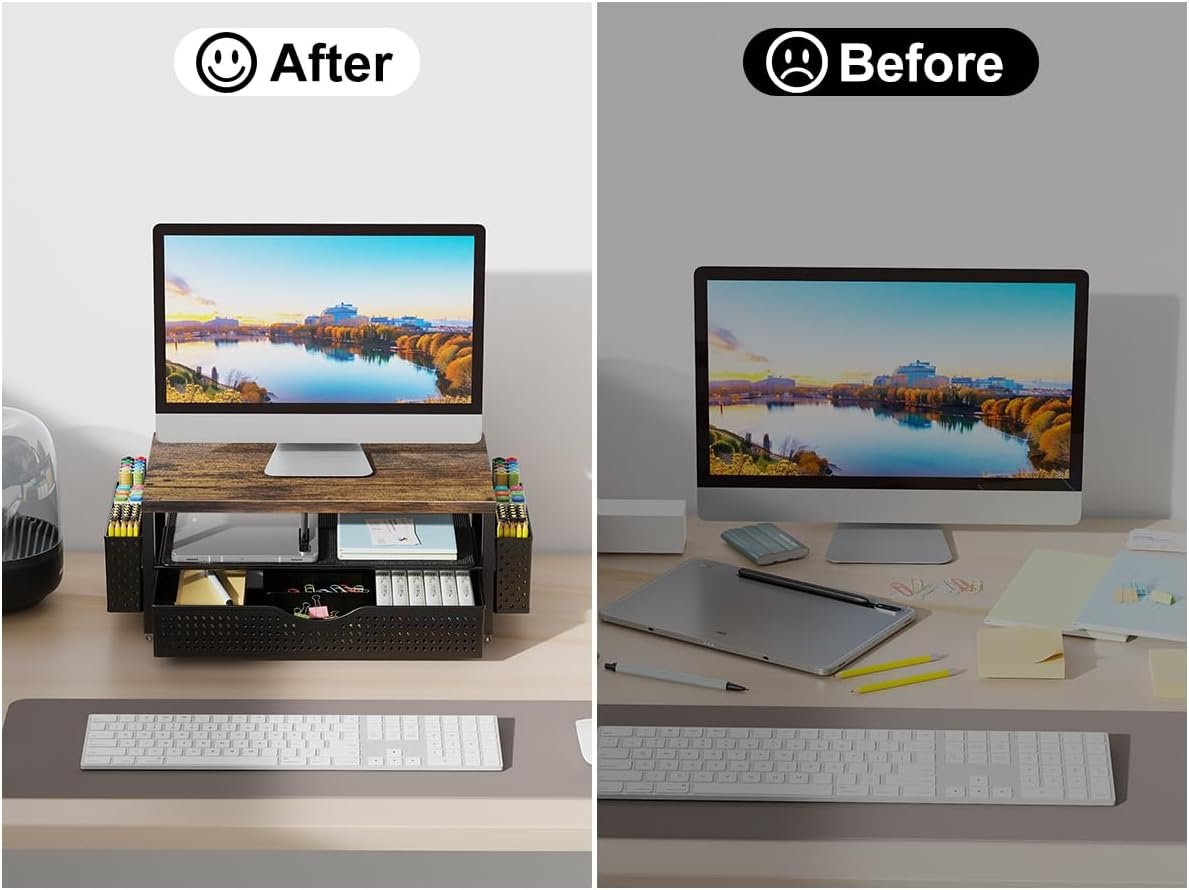 【Organized Storage】This desk monitor stand/organizer features two tiers of storage for files and notes. Equipped with two pen holders and a drawer , it effortlessly organizes pens, scissors, and other desk essentials, keeping everything within reach.