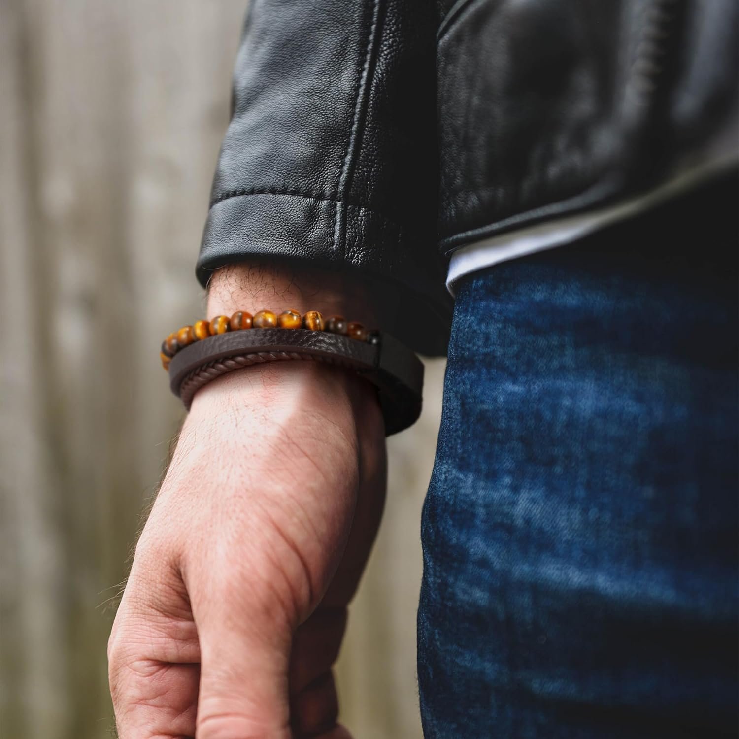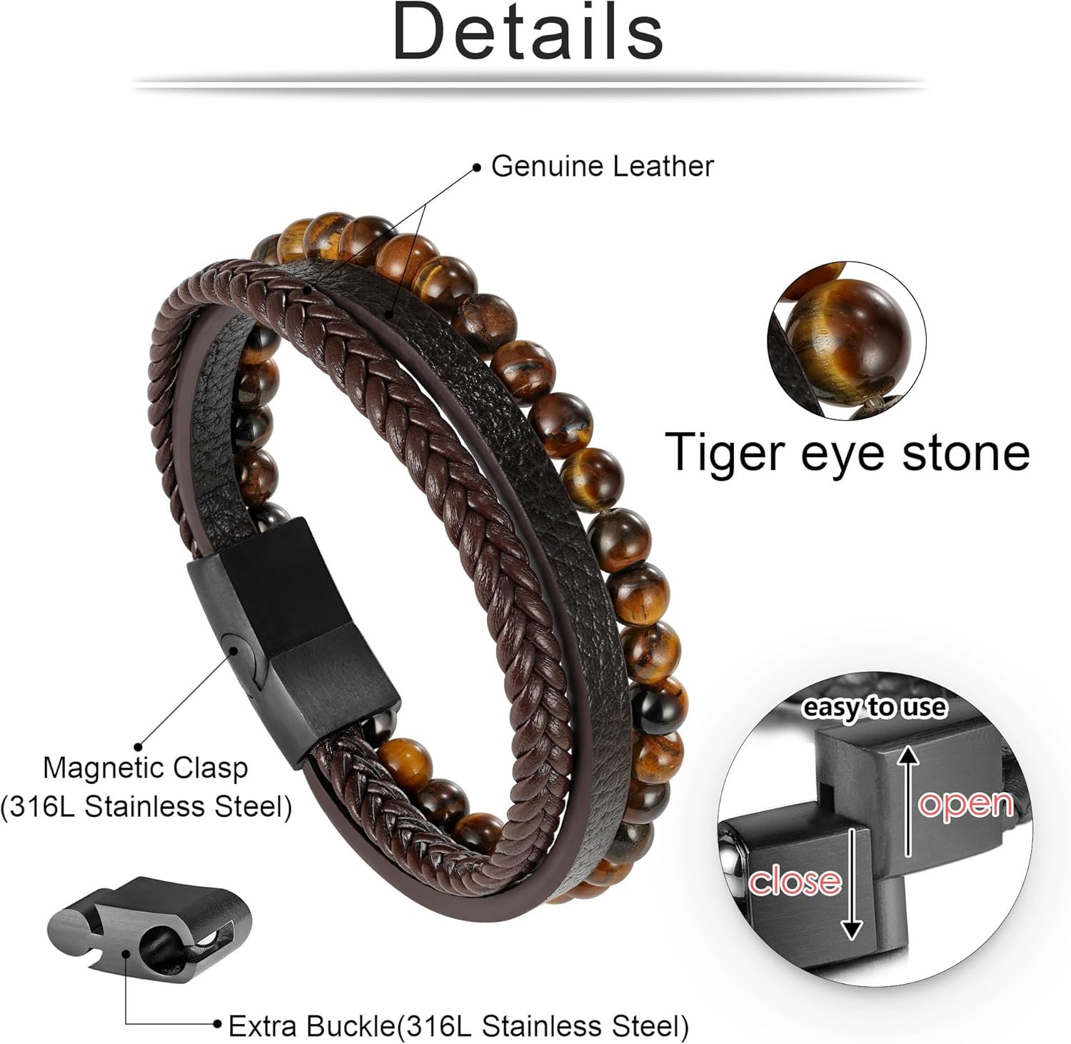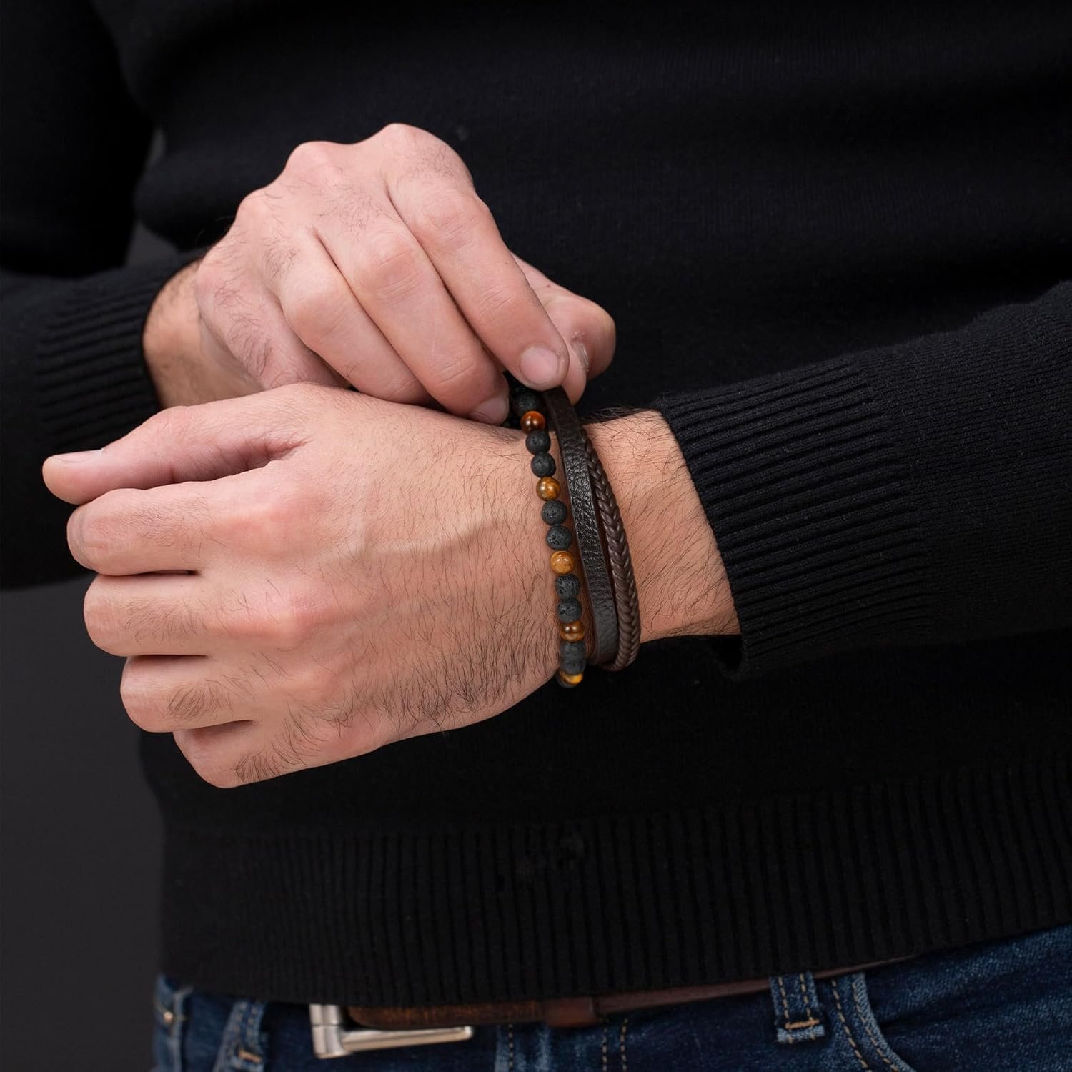 Gifts for Men – Mens Bracelet, Braided Leather Beaded Bracelets Mens Jewelry 6mm Tiger Eye Lava Rock Stone Handmade Bracelet With Adjustable Magnetic Clasp