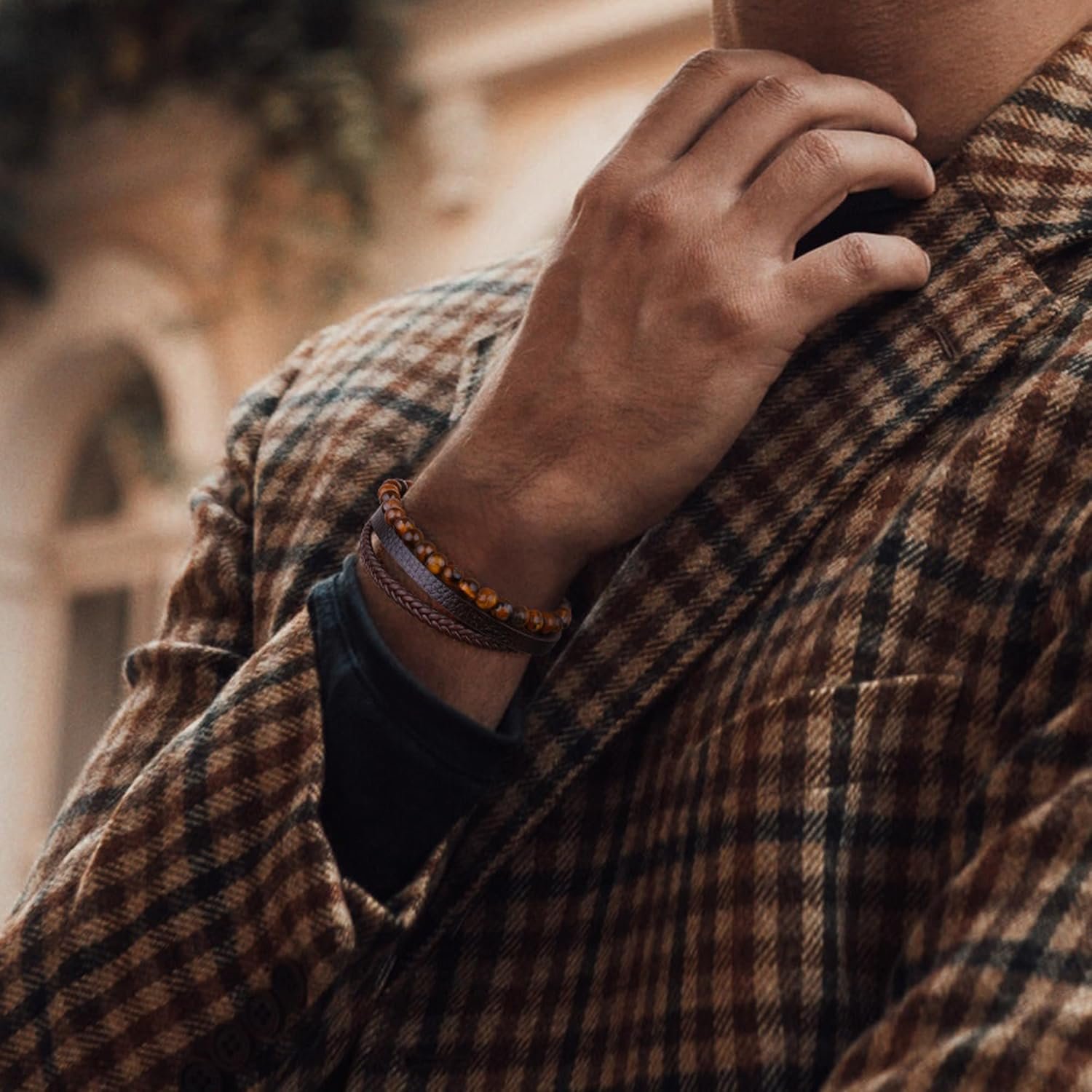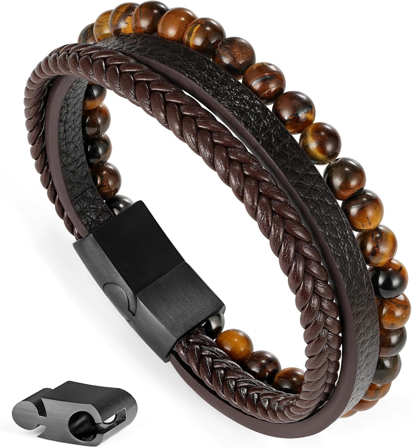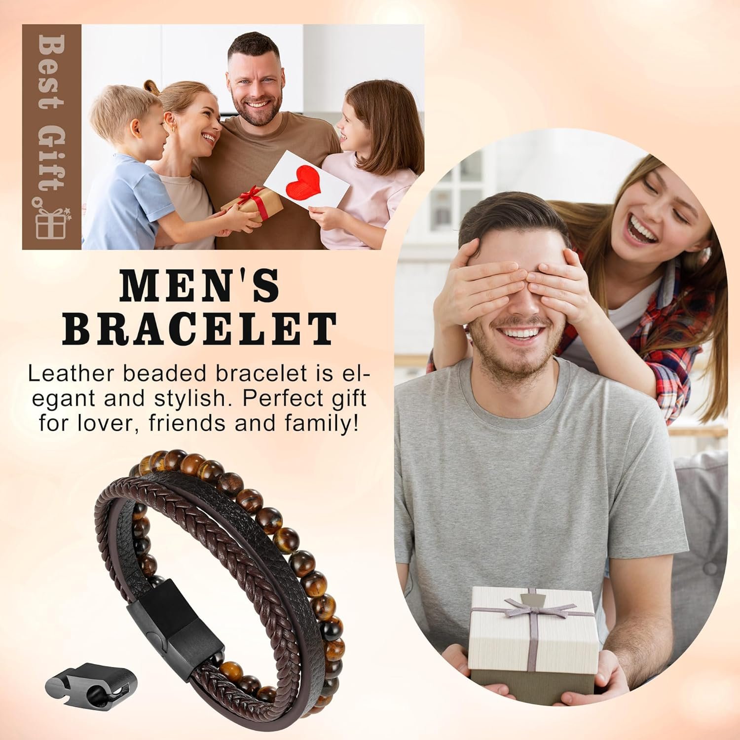 Gifts for Men – Mens Bracelet, Braided Leather Beaded Bracelets Mens Jewelry 6mm Tiger Eye Lava Rock Stone Handmade Bracelet With Adjustable Magnetic Clasp
