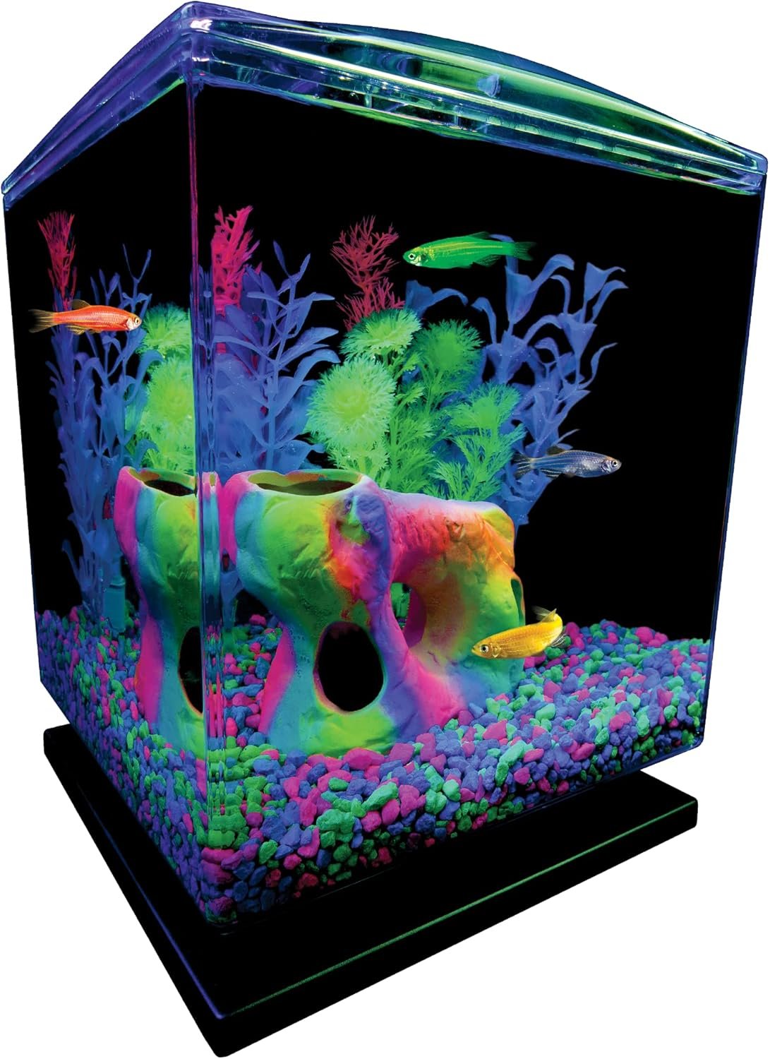 BASK IN THE GLOW: Fluorescent-accented gravel stands out under GloFish blue LED lights.