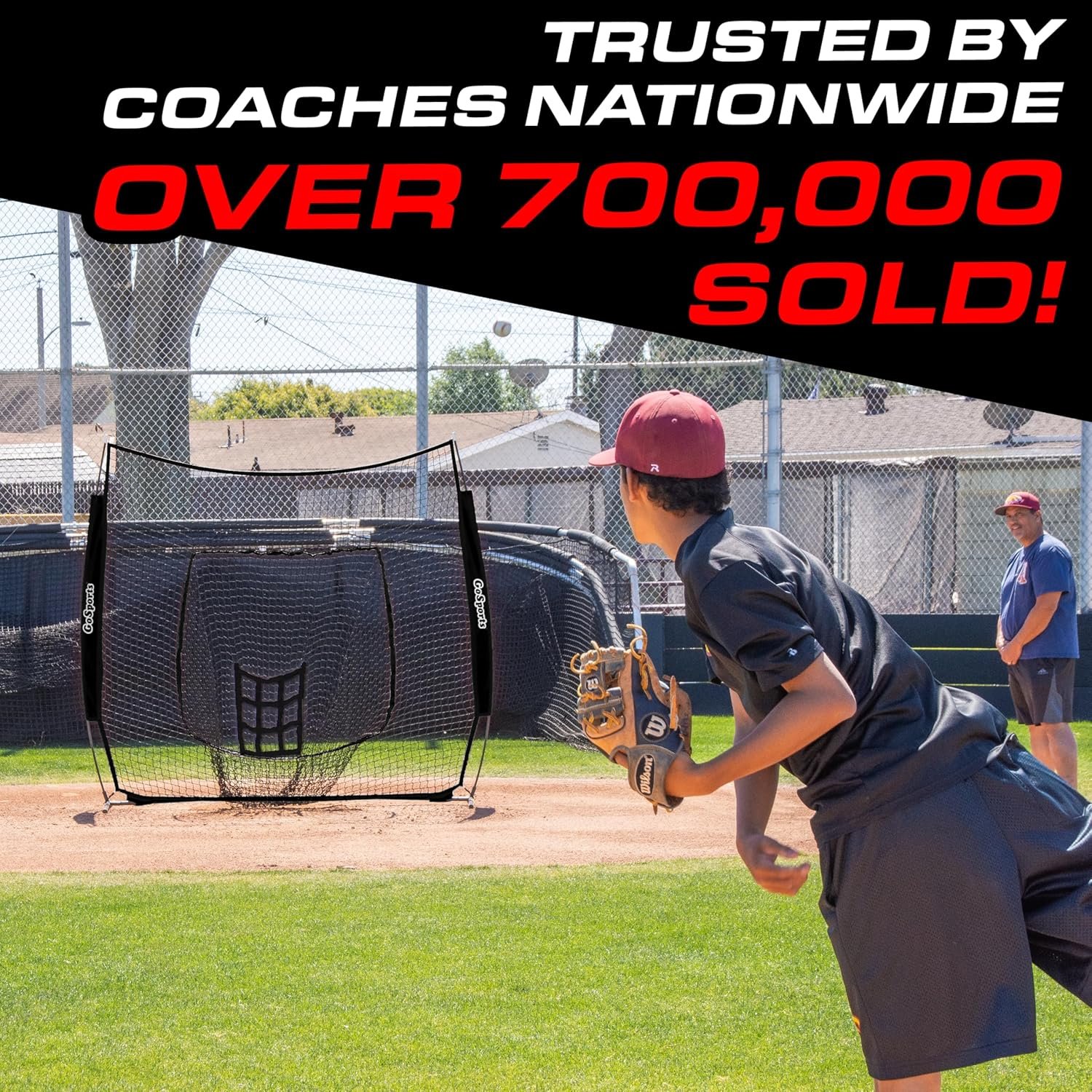 GoSports 7 ft x 7 ft Baseball & Softball Nets – Red, Black, or PRO -Practice Hitting & Pitching Net with Bow Type Frame, Carry Bag and Strike Zone, Great for All Skill Levels