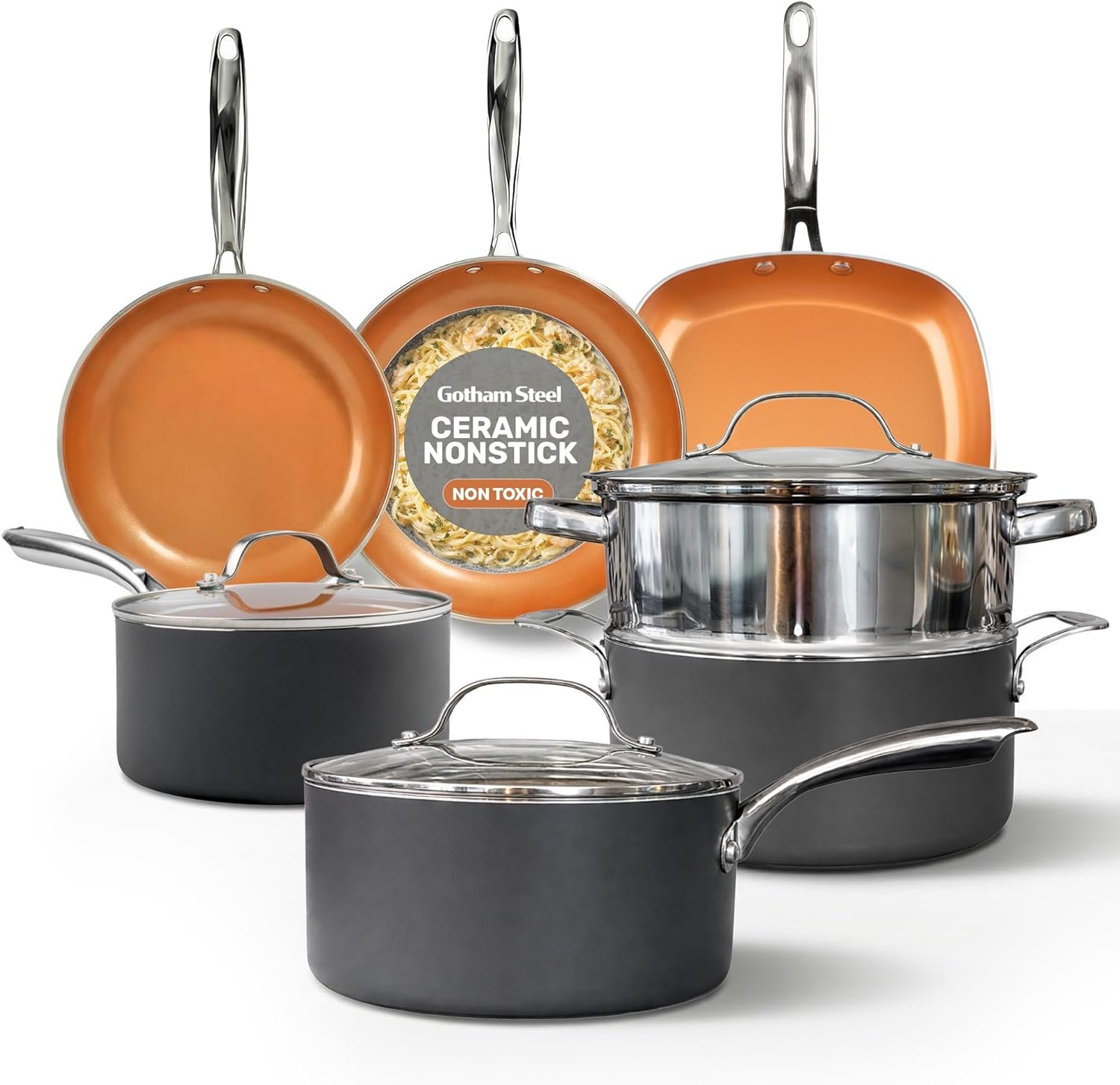 Gotham Steel 12 Pc Ceramic Cookware Set Nonstick, Ceramic Pots and Pans Set Non Stick with Steamer for Cooking, Non Toxic PFOA PFOS Free, Ergonomic Stay Cool Handles, Oven & Dishwasher Safe, Copper
